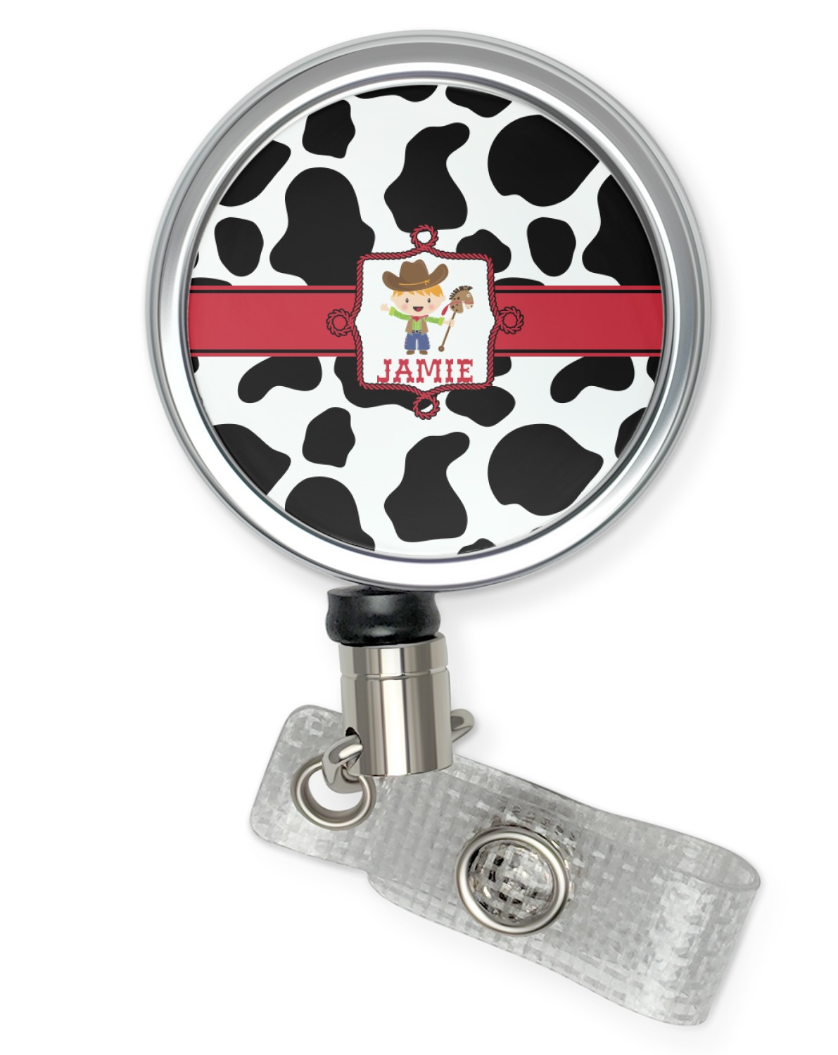 This western themed design is perfect for a cowboy or cowgirl. The background is cow print, with a red ribbon in the center. The label is made of rope and you can customize it by choosing a cowgirl or a cowboy.