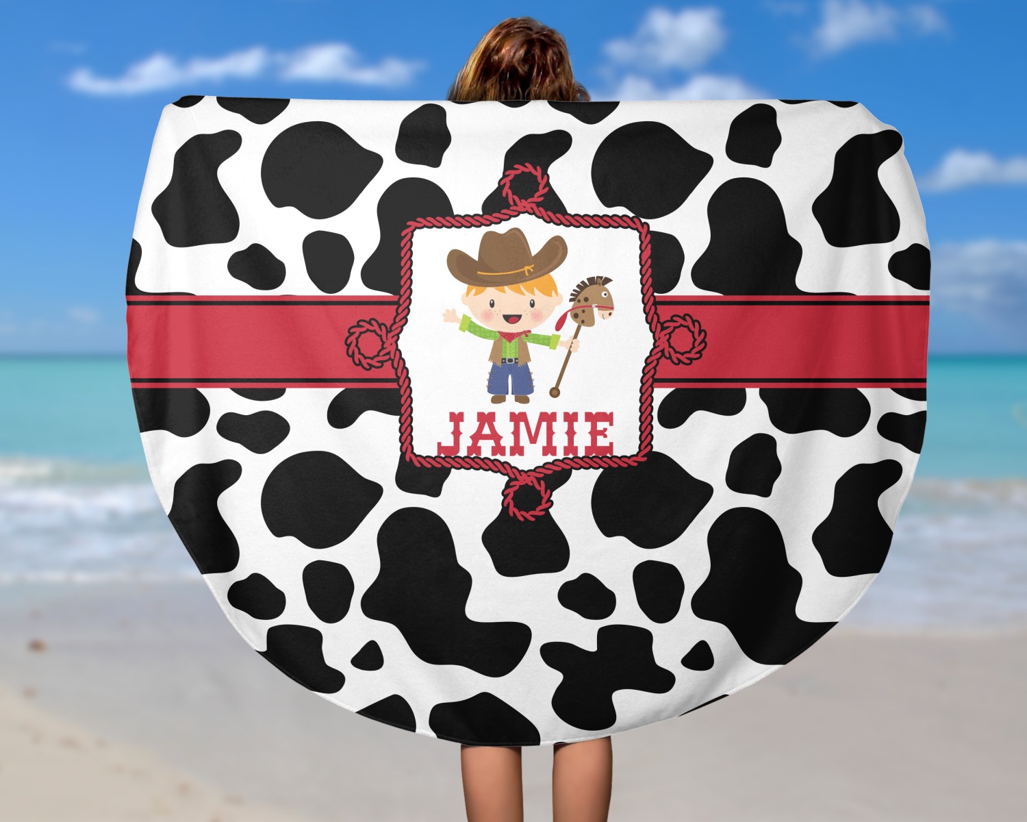This western themed design is perfect for a cowboy or cowgirl. The background is cow print, with a red ribbon in the center. The label is made of rope and you can customize it by choosing a cowgirl or a cowboy.
