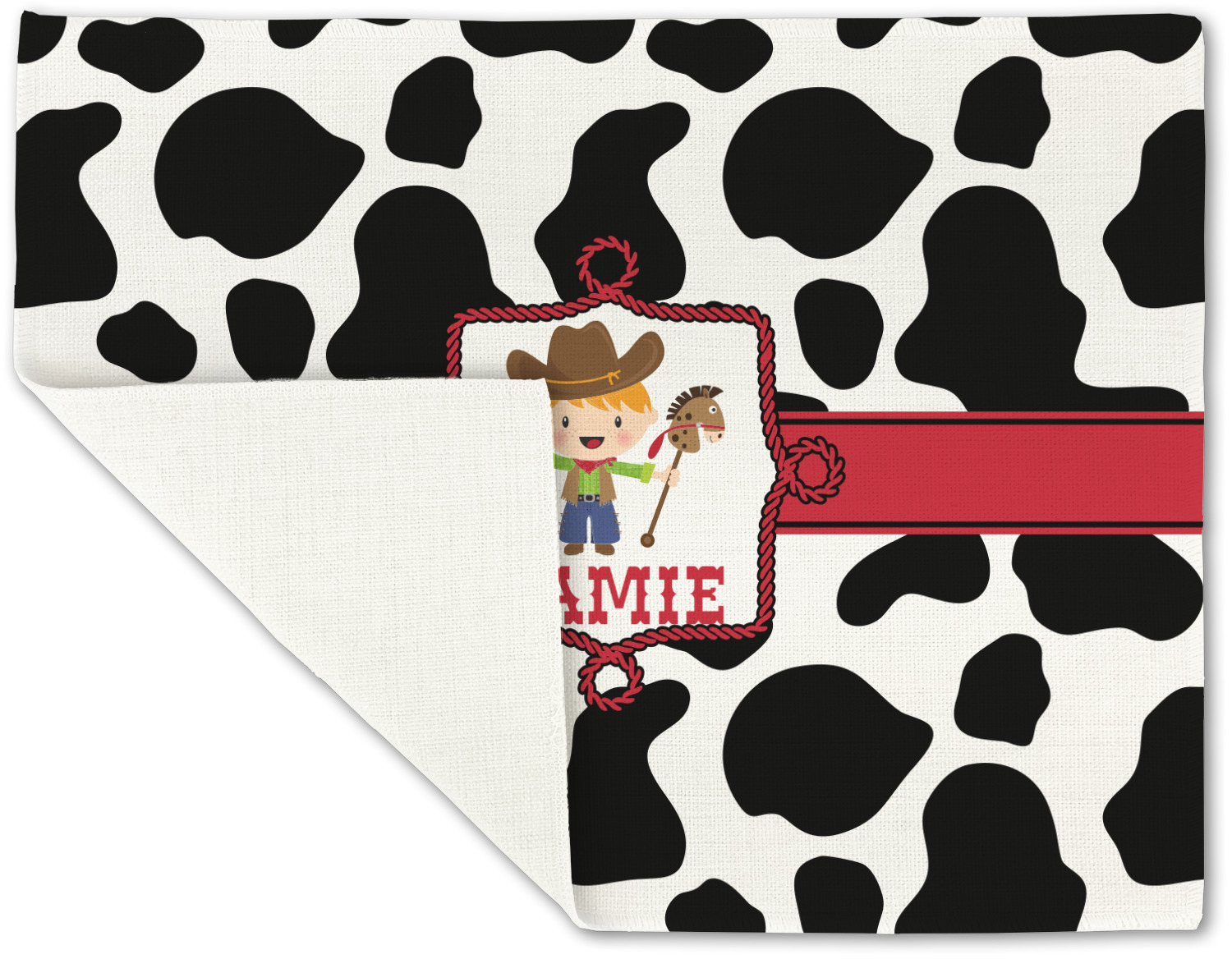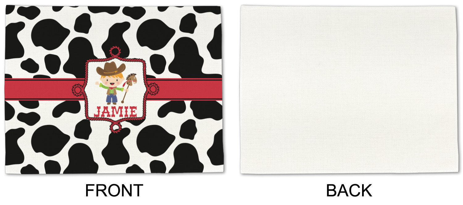 This western themed design is perfect for a cowboy or cowgirl. The background is cow print, with a red ribbon in the center. The label is made of rope and you can customize it by choosing a cowgirl or a cowboy.