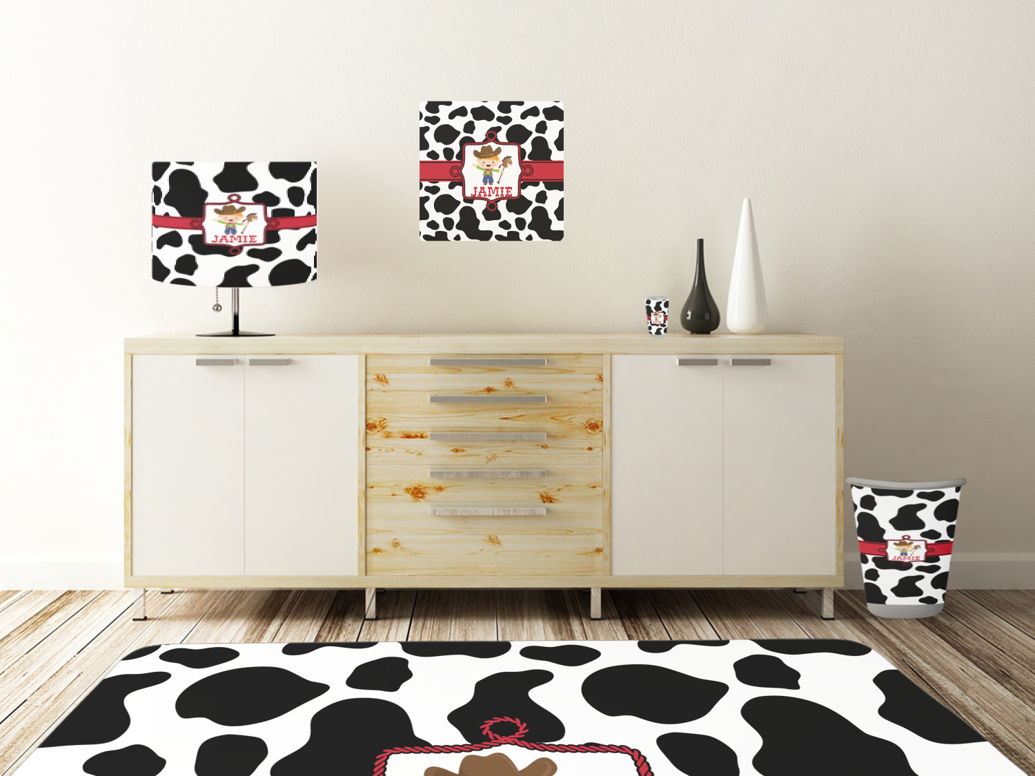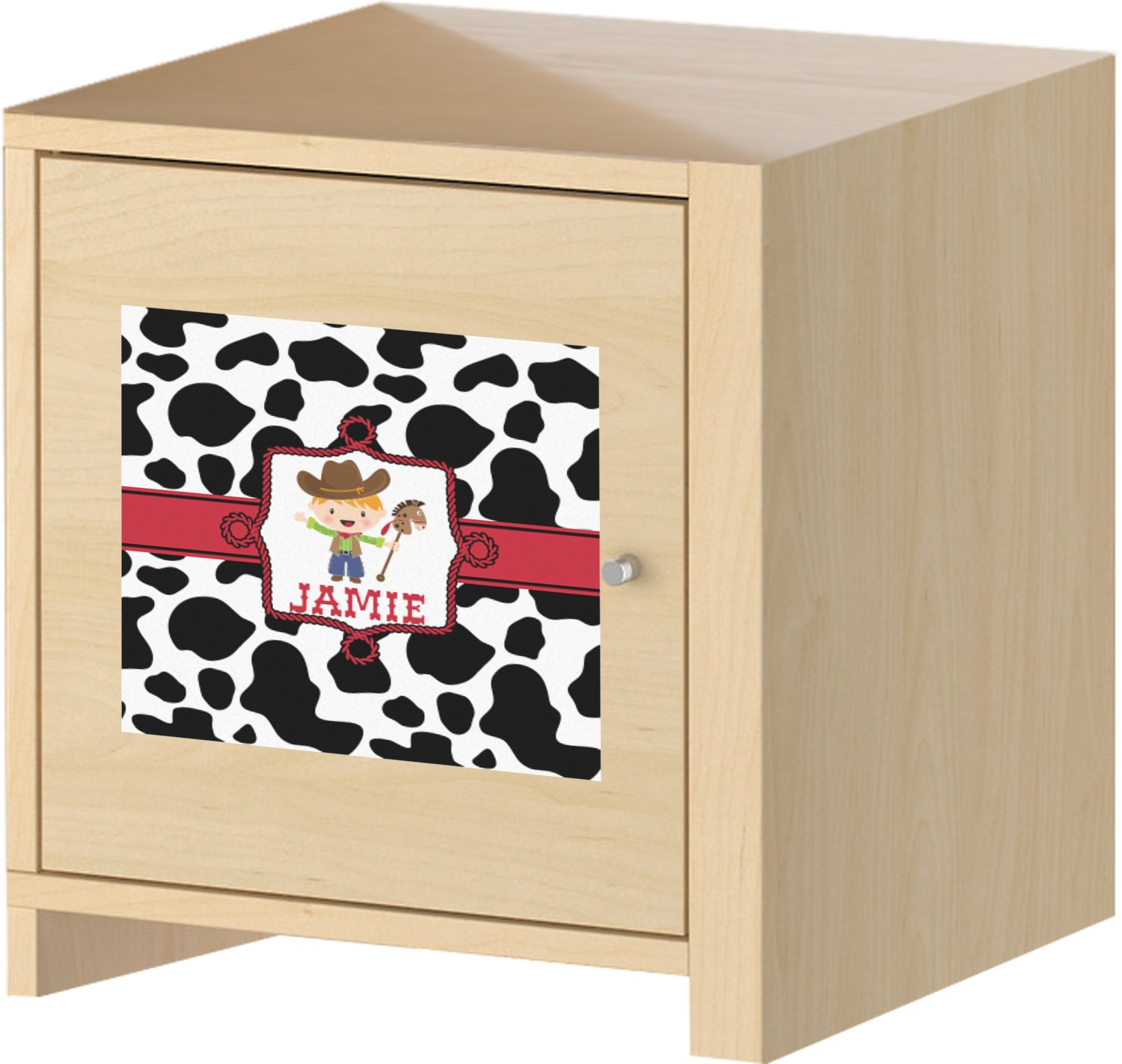 This western themed design is perfect for a cowboy or cowgirl. The background is cow print, with a red ribbon in the center. The label is made of rope and you can customize it by choosing a cowgirl or a cowboy.