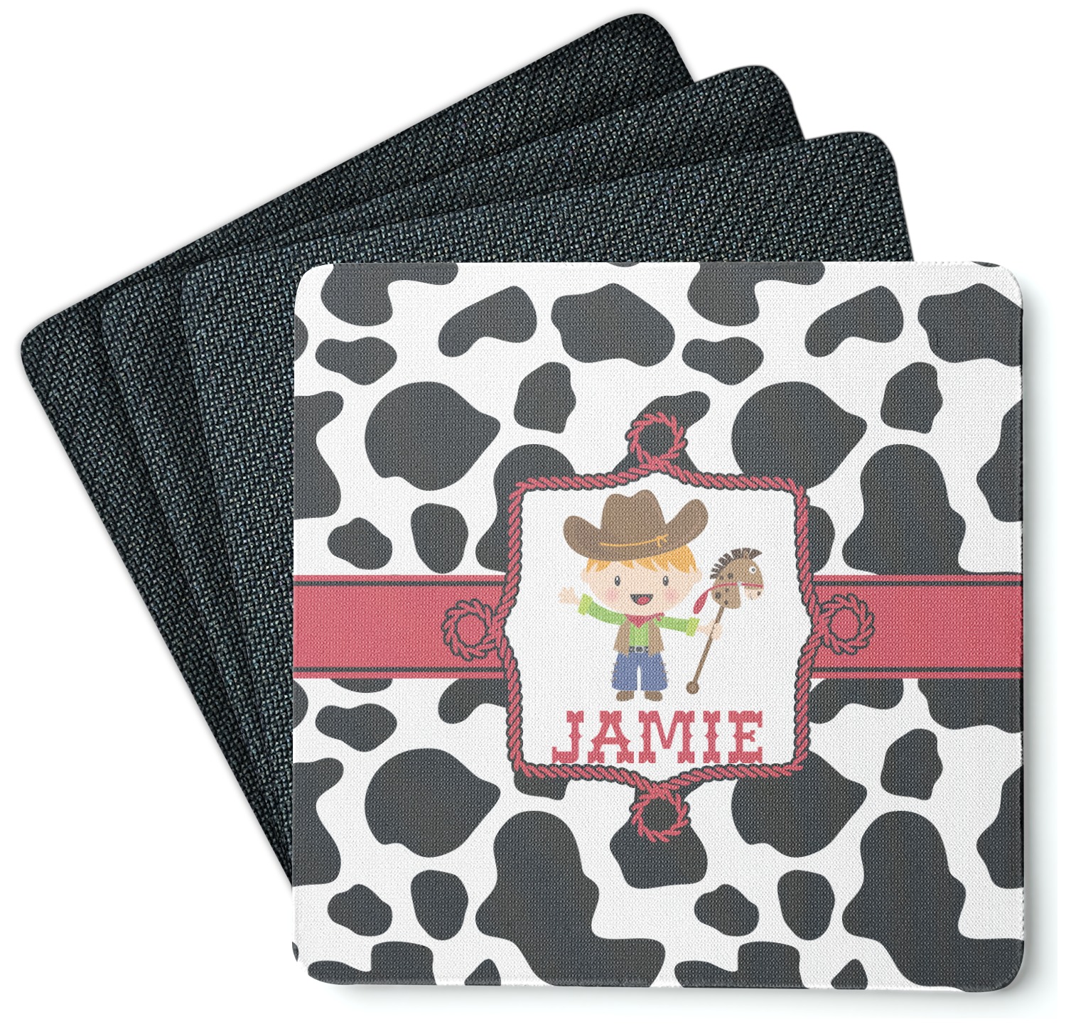 This western themed design is perfect for a cowboy or cowgirl. The background is cow print, with a red ribbon in the center. The label is made of rope and you can customize it by choosing a cowgirl or a cowboy.