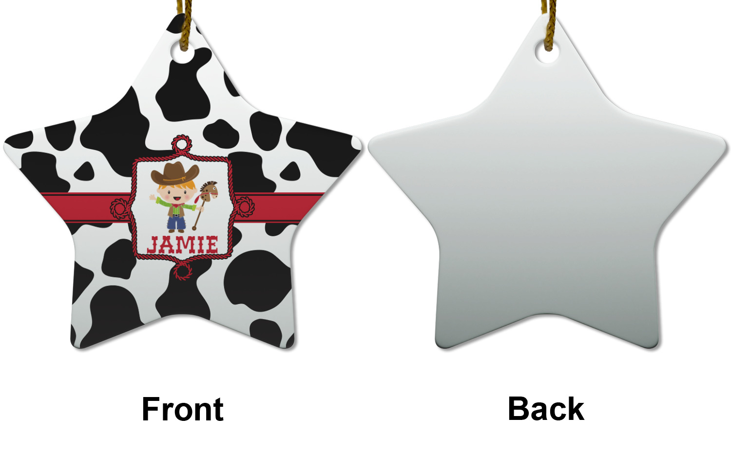 This western themed design is perfect for a cowboy or cowgirl. The background is cow print, with a red ribbon in the center. The label is made of rope and you can customize it by choosing a cowgirl or a cowboy.