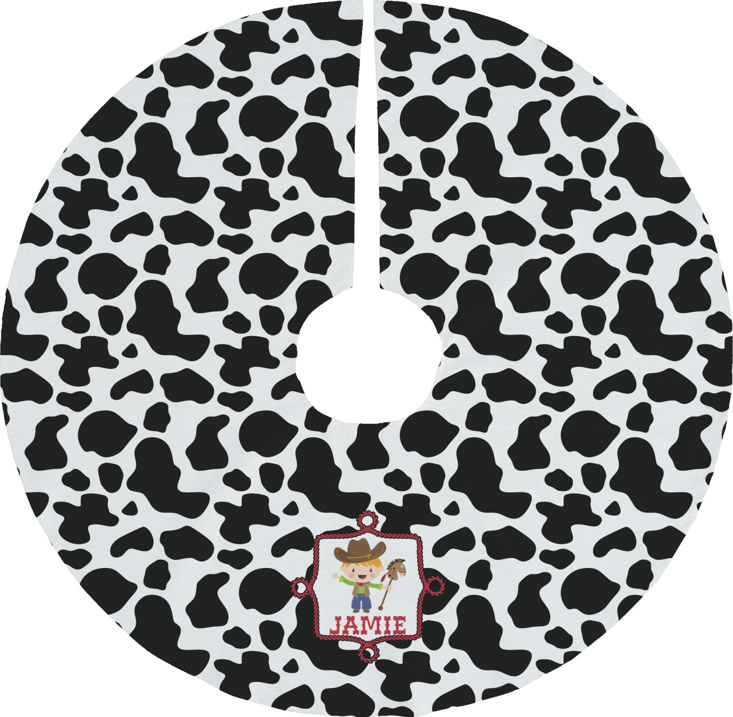 This western themed design is perfect for a cowboy or cowgirl. The background is cow print, with a red ribbon in the center. The label is made of rope and you can customize it by choosing a cowgirl or a cowboy.