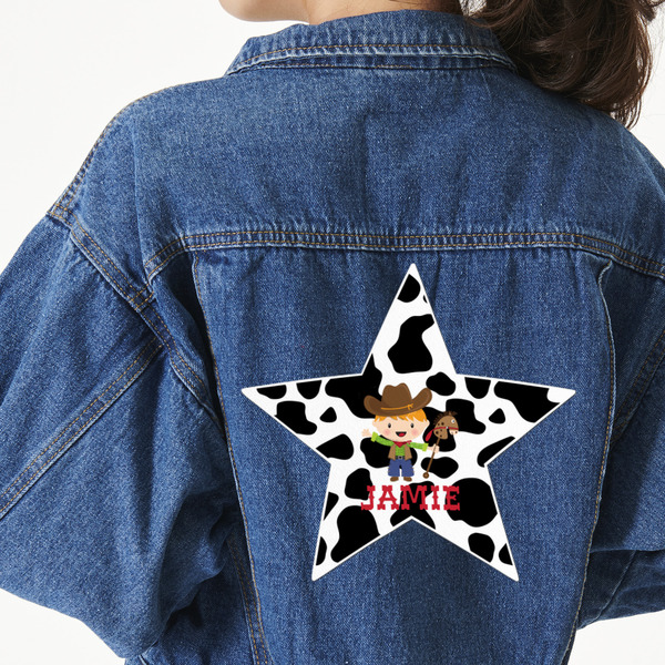 This western themed design is perfect for a cowboy or cowgirl. The background is cow print, with a red ribbon in the center. The label is made of rope and you can customize it by choosing a cowgirl or a cowboy.