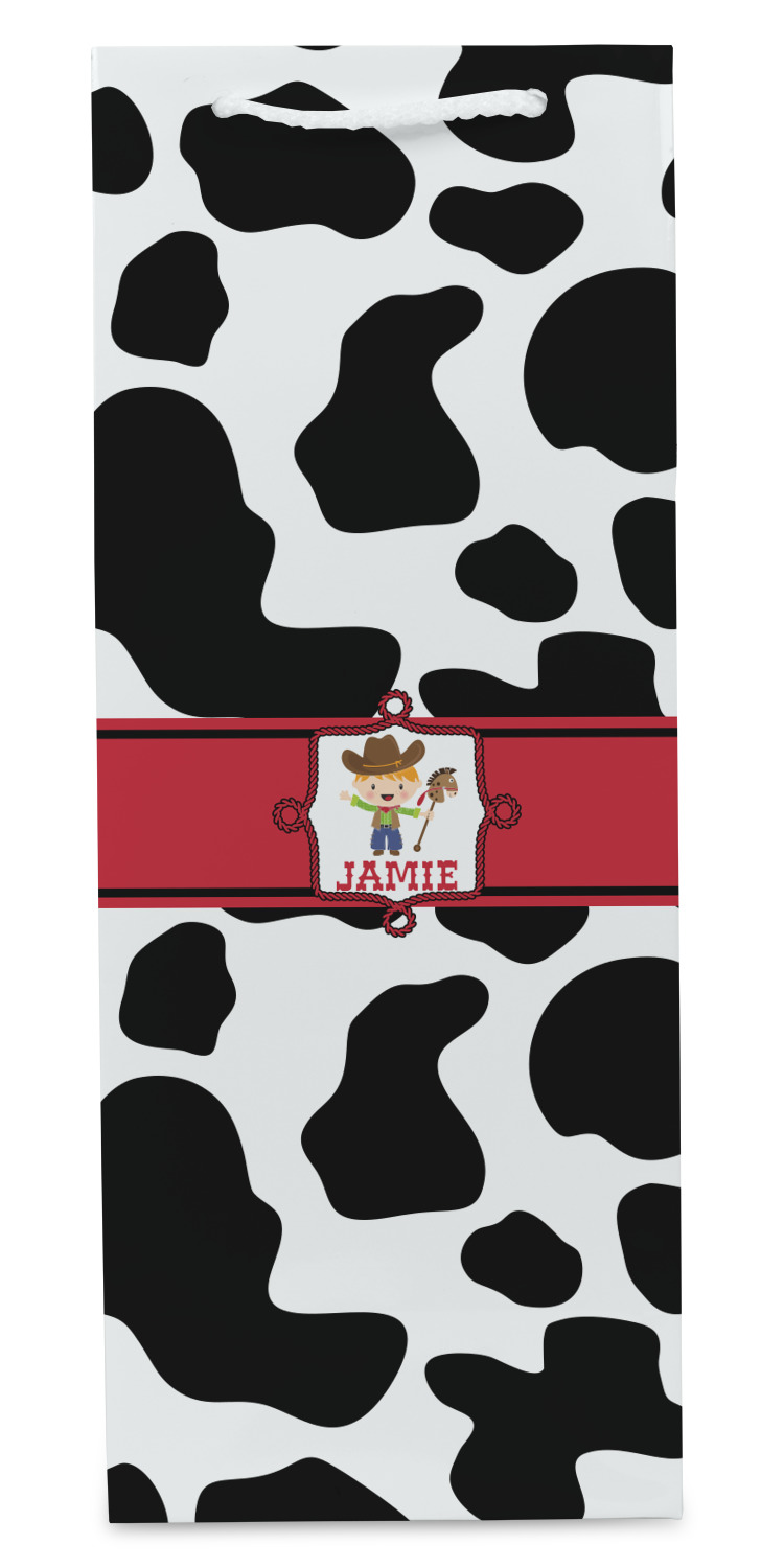This western themed design is perfect for a cowboy or cowgirl. The background is cow print, with a red ribbon in the center. The label is made of rope and you can customize it by choosing a cowgirl or a cowboy.