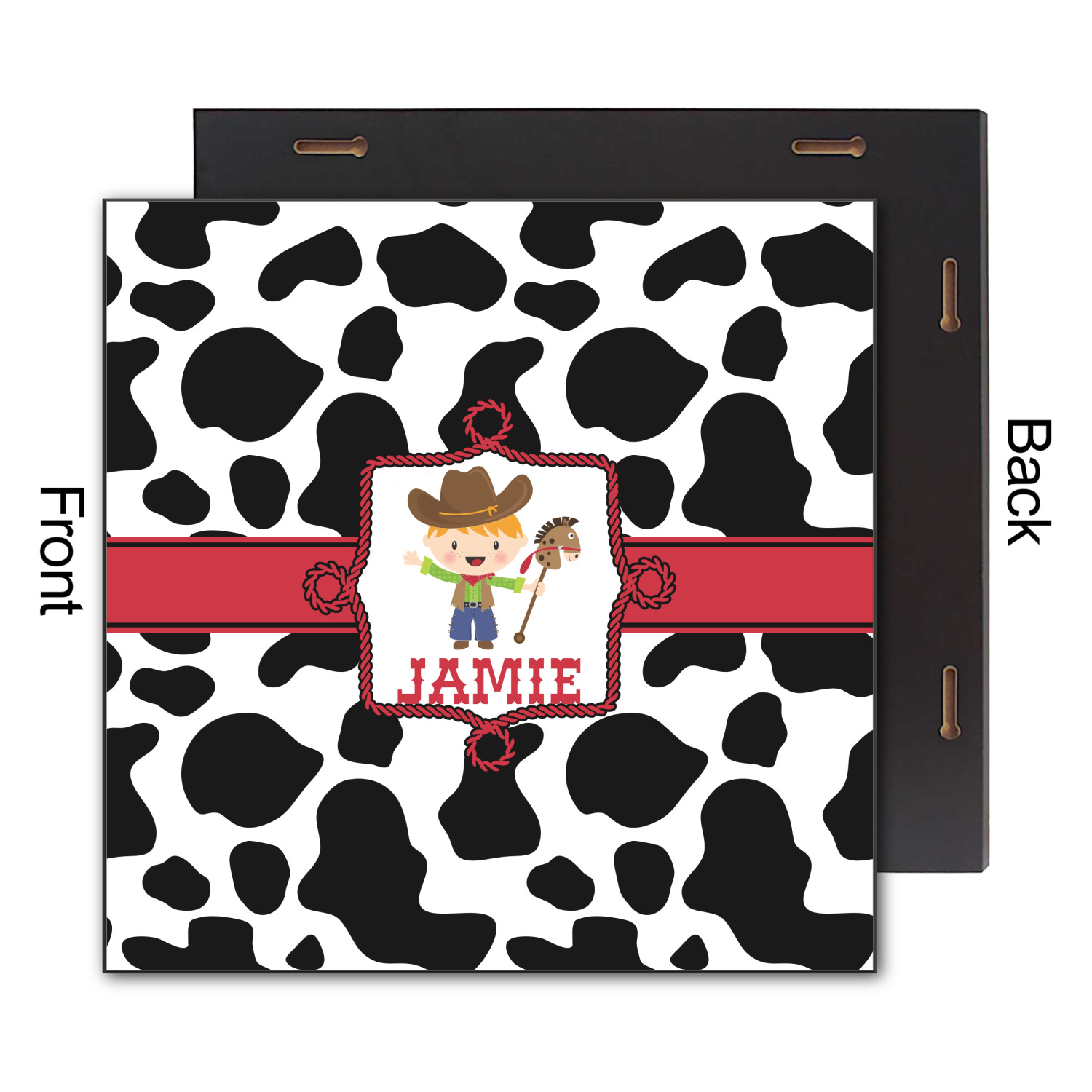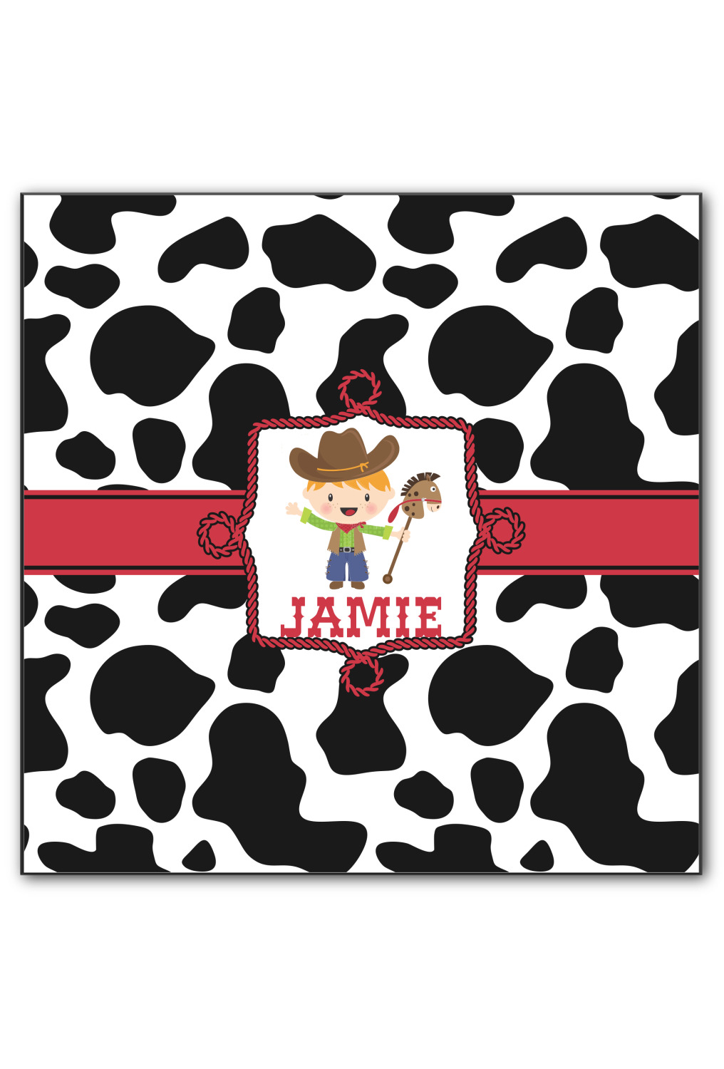 This western themed design is perfect for a cowboy or cowgirl. The background is cow print, with a red ribbon in the center. The label is made of rope and you can customize it by choosing a cowgirl or a cowboy.