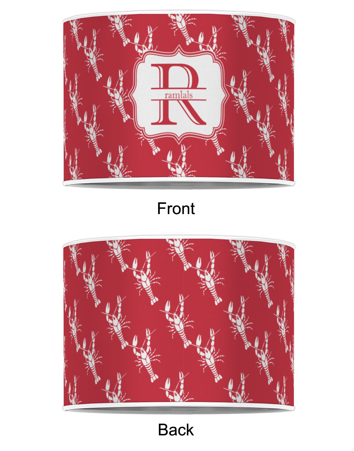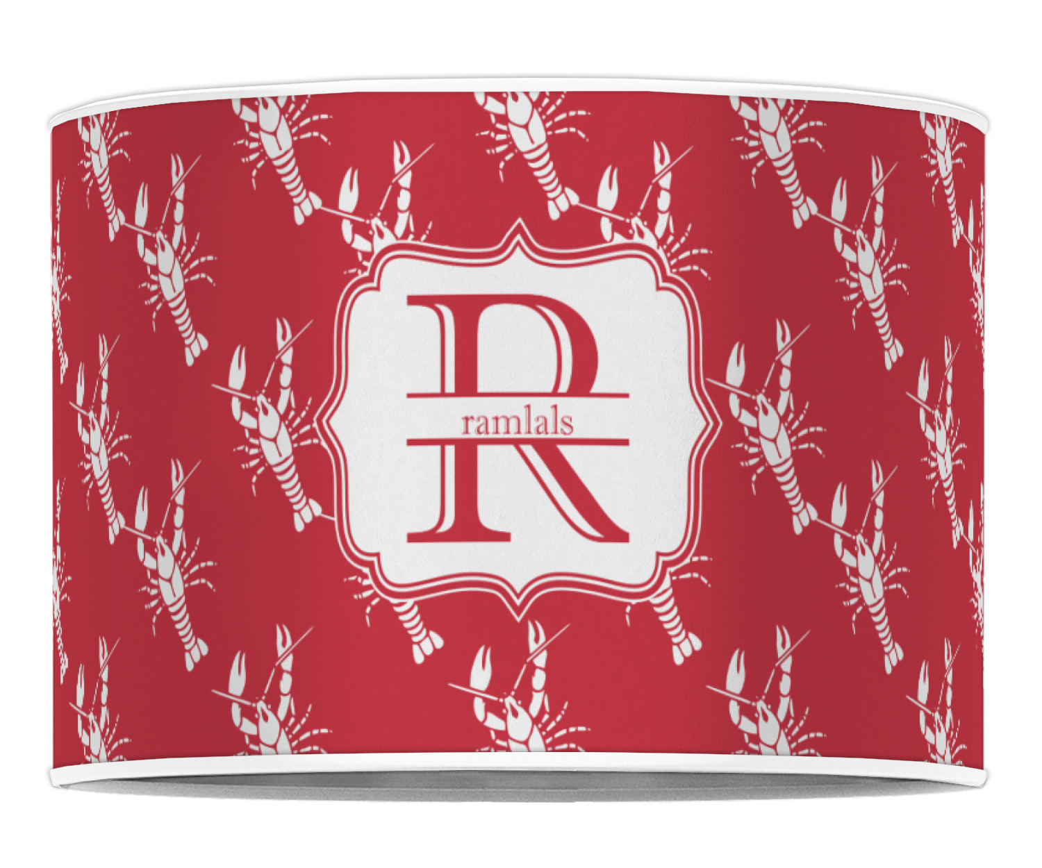 The design is done is a red background with white crawfish, while the personalization is inside a beautiful decorative rectangular frame. The personalization style is an initial along with the name.