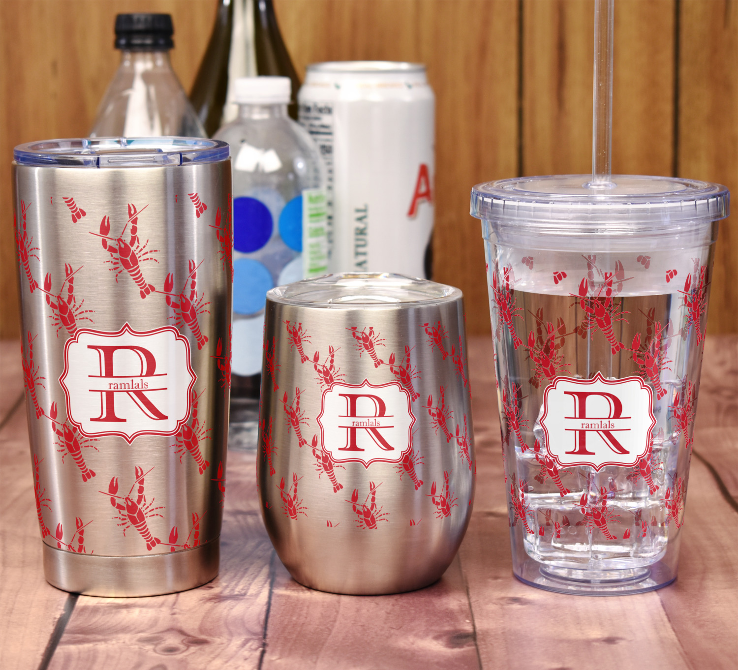 The design is done is a red background with white crawfish, while the personalization is inside a beautiful decorative rectangular frame. The personalization style is an initial along with the name.