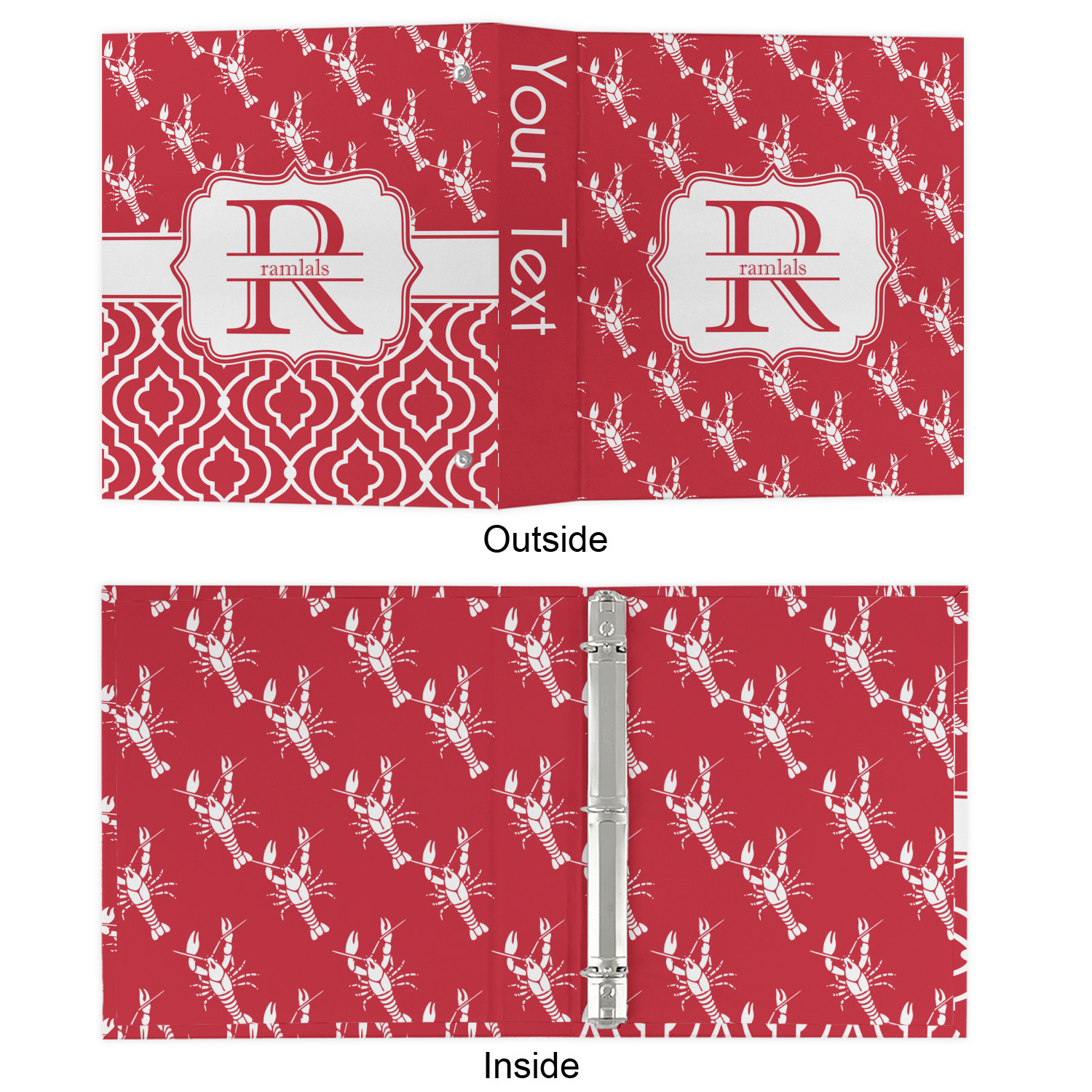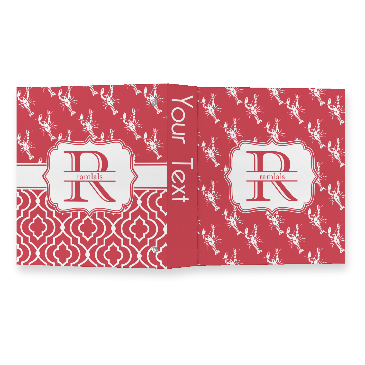 The design is done is a red background with white crawfish, while the personalization is inside a beautiful decorative rectangular frame. The personalization style is an initial along with the name.