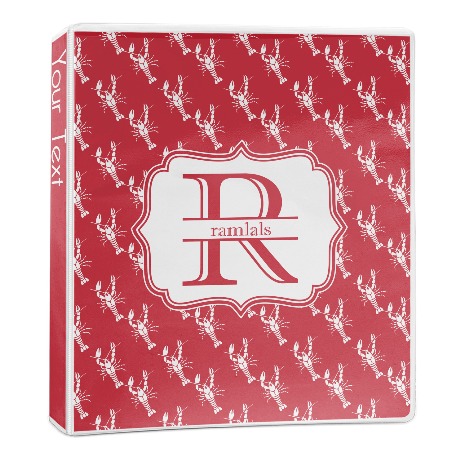 The design is done is a red background with white crawfish, while the personalization is inside a beautiful decorative rectangular frame. The personalization style is an initial along with the name.