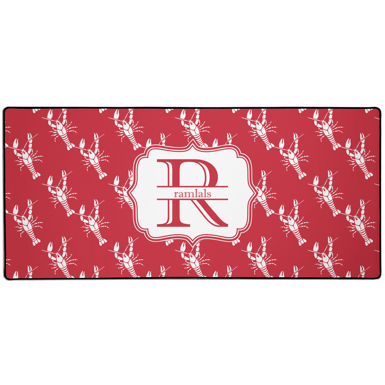 The design is done is a red background with white crawfish, while the personalization is inside a beautiful decorative rectangular frame. The personalization style is an initial along with the name.