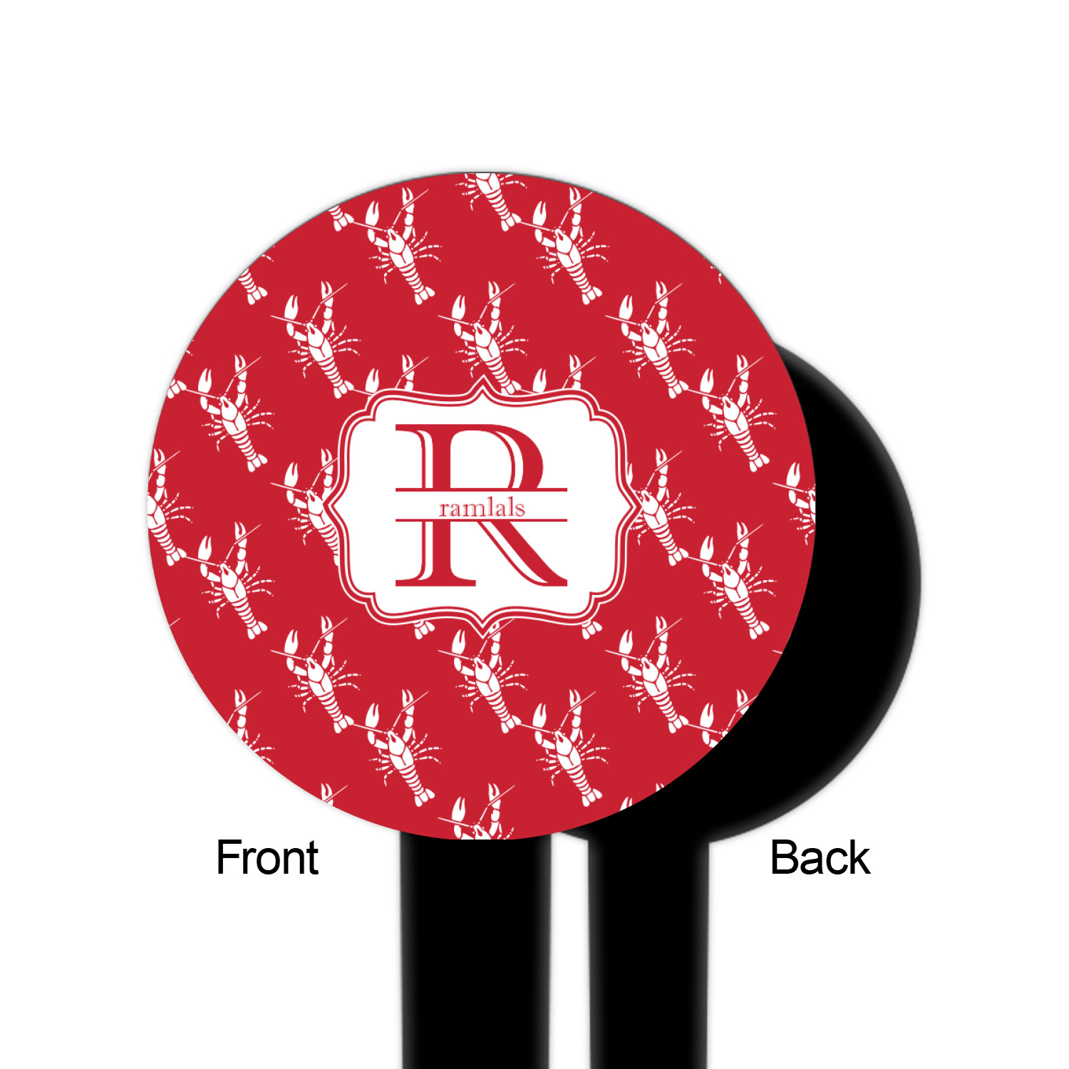 The design is done is a red background with white crawfish, while the personalization is inside a beautiful decorative rectangular frame. The personalization style is an initial along with the name.