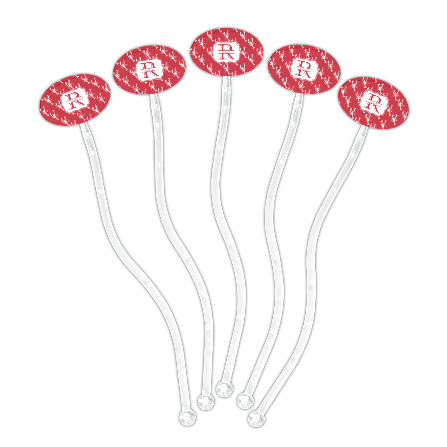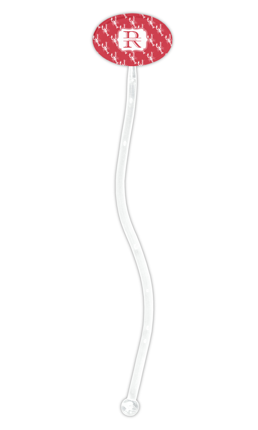 The design is done is a red background with white crawfish, while the personalization is inside a beautiful decorative rectangular frame. The personalization style is an initial along with the name.