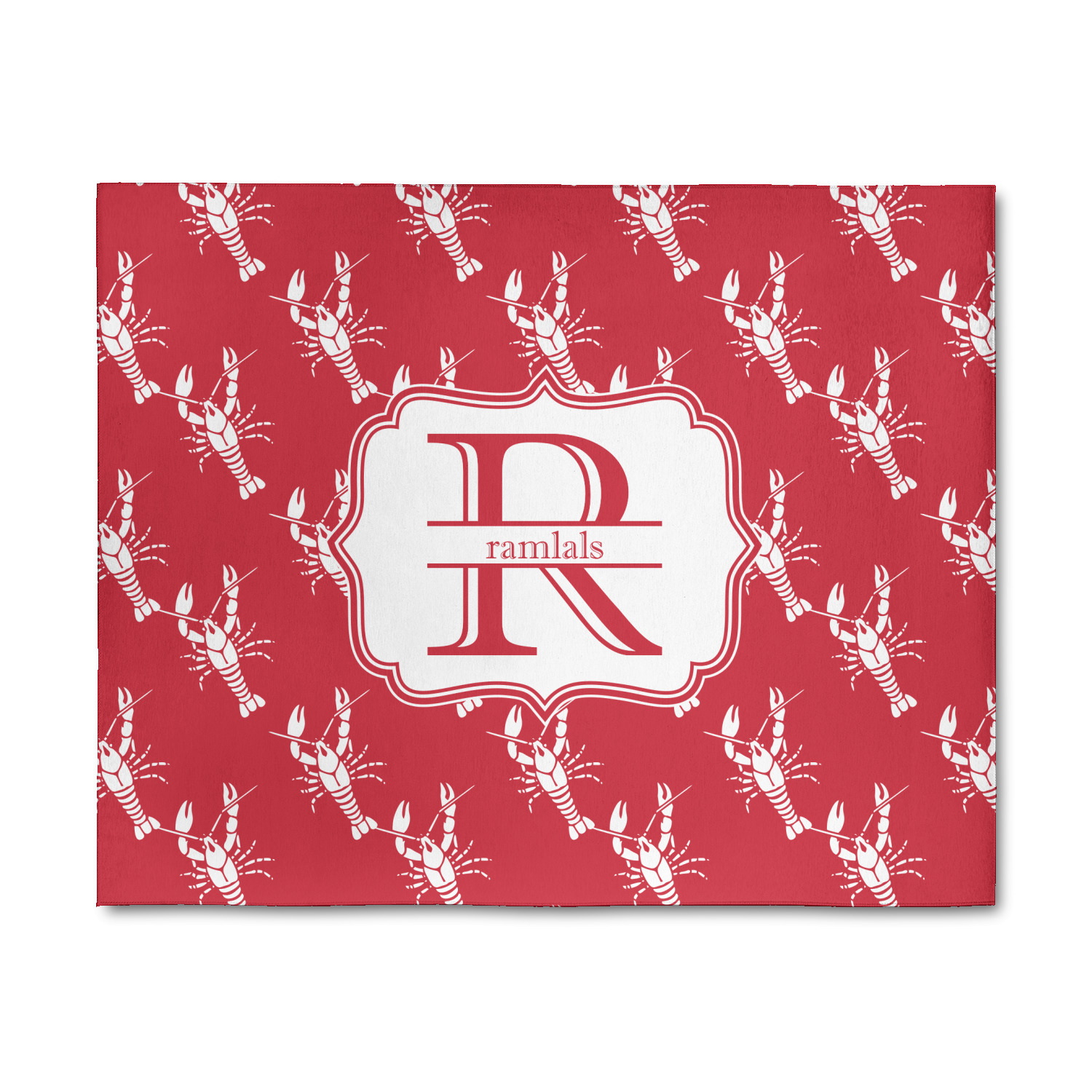 The design is done is a red background with white crawfish, while the personalization is inside a beautiful decorative rectangular frame. The personalization style is an initial along with the name.