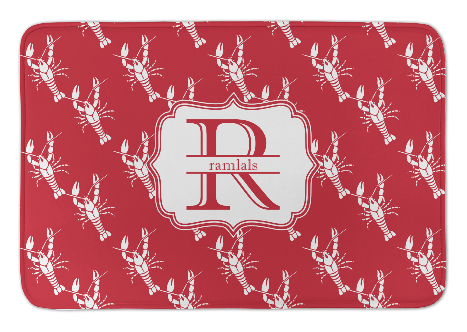 The design is done is a red background with white crawfish, while the personalization is inside a beautiful decorative rectangular frame. The personalization style is an initial along with the name.
