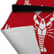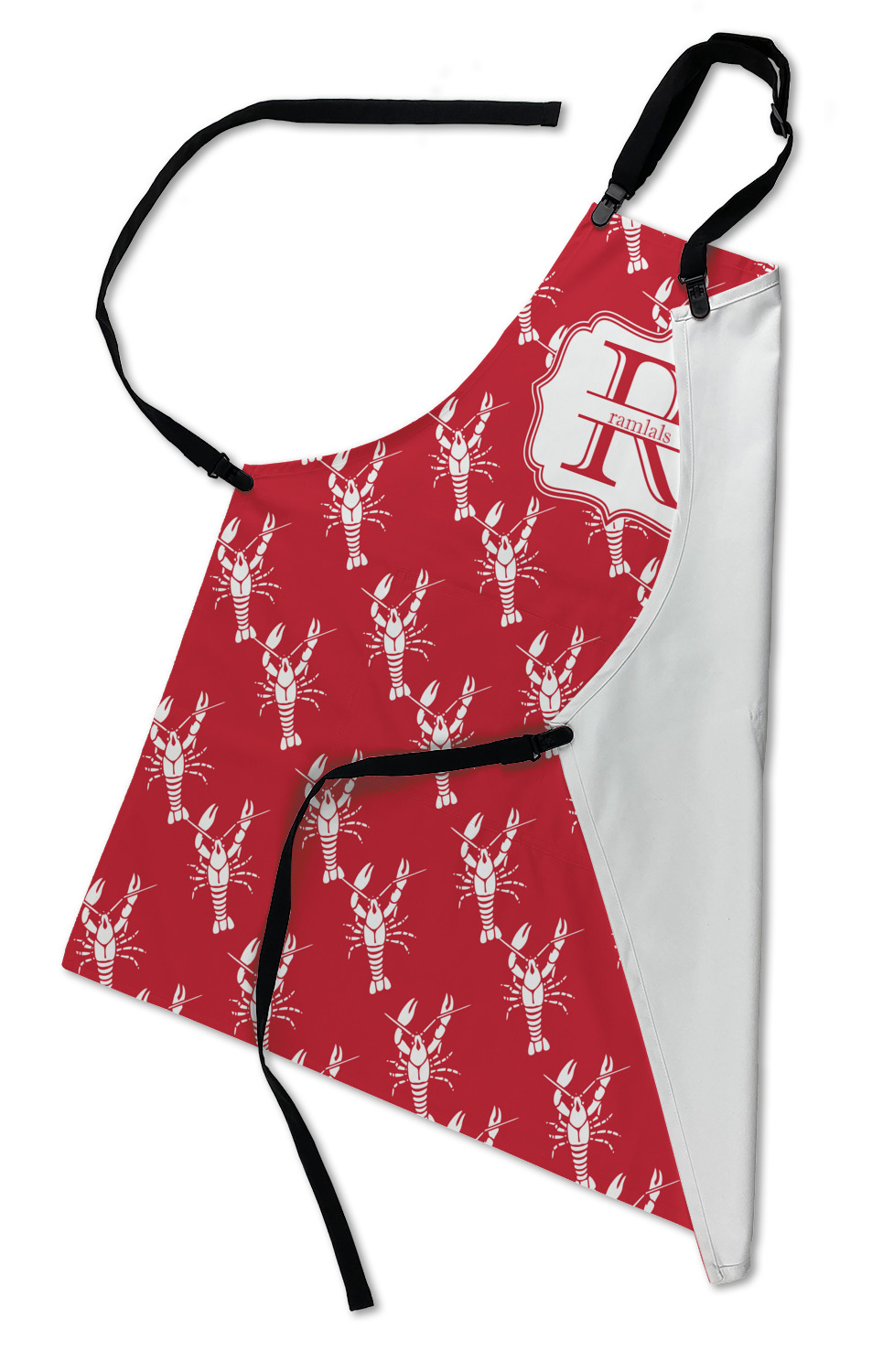 The design is done is a red background with white crawfish, while the personalization is inside a beautiful decorative rectangular frame. The personalization style is an initial along with the name.