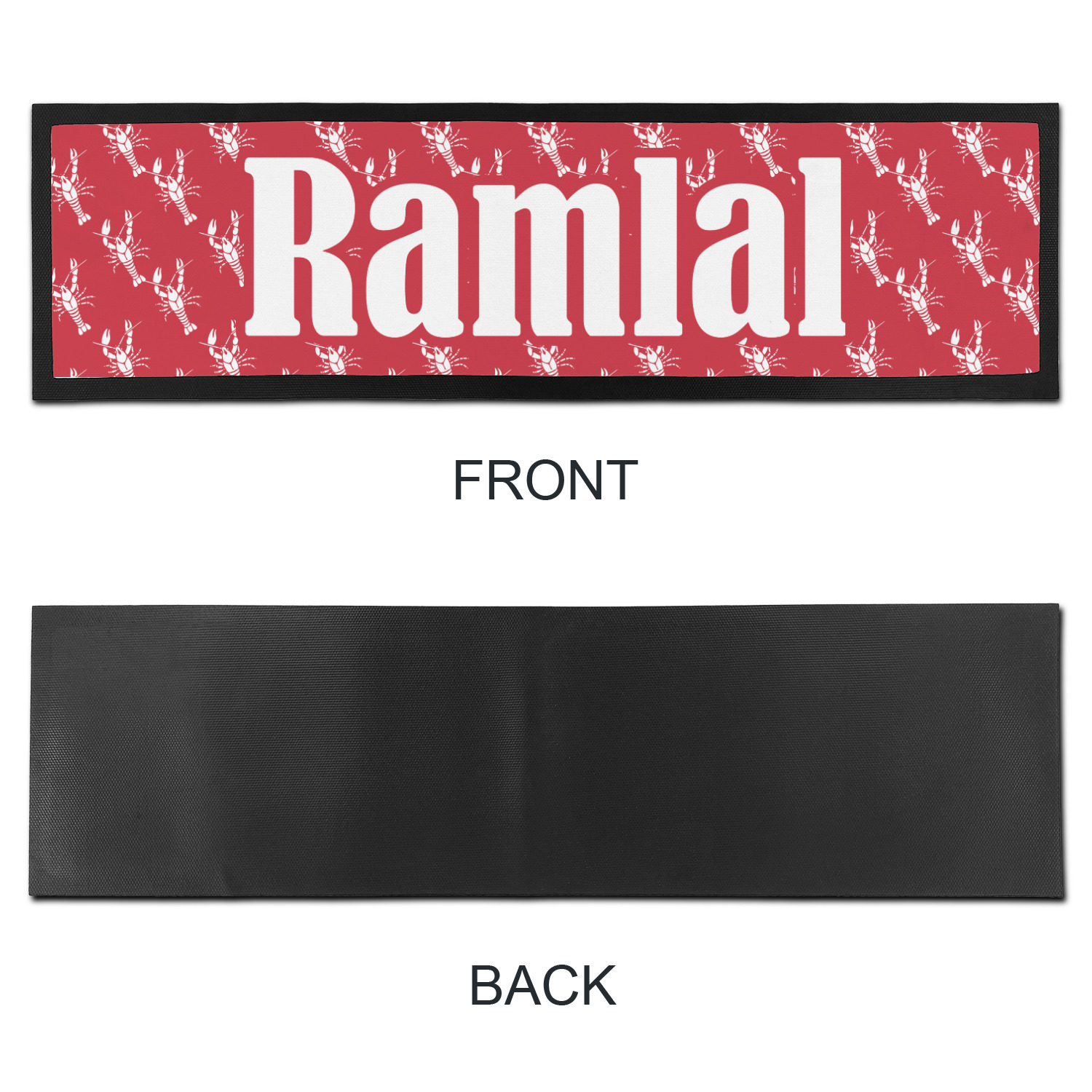 The design is done is a red background with white crawfish, while the personalization is inside a beautiful decorative rectangular frame. The personalization style is an initial along with the name.