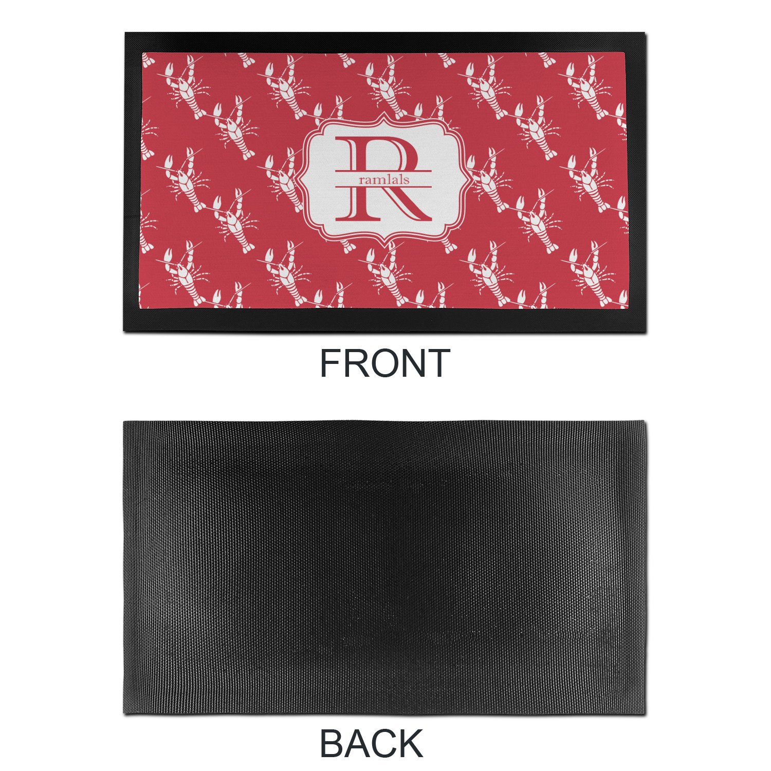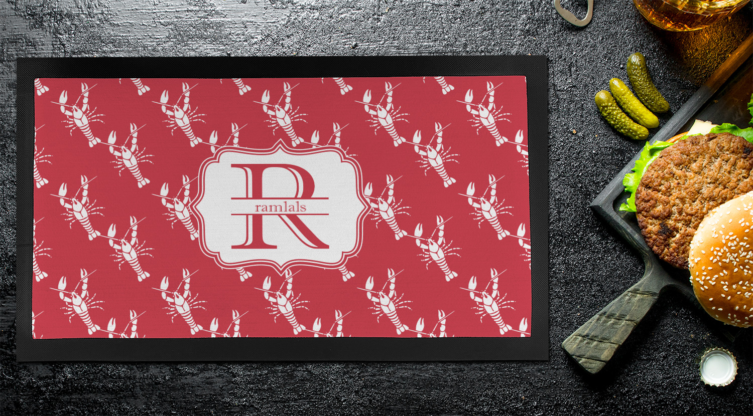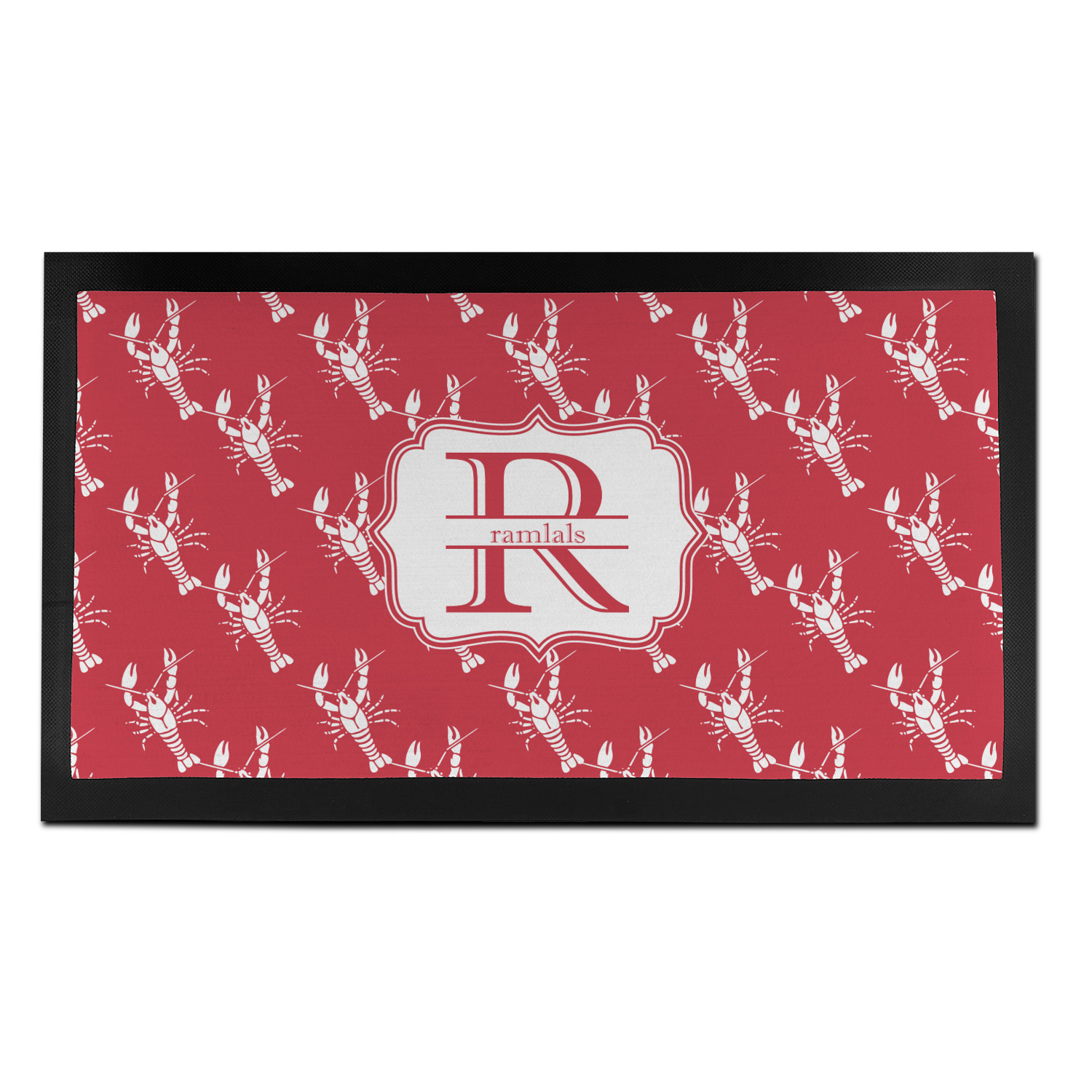 The design is done is a red background with white crawfish, while the personalization is inside a beautiful decorative rectangular frame. The personalization style is an initial along with the name.