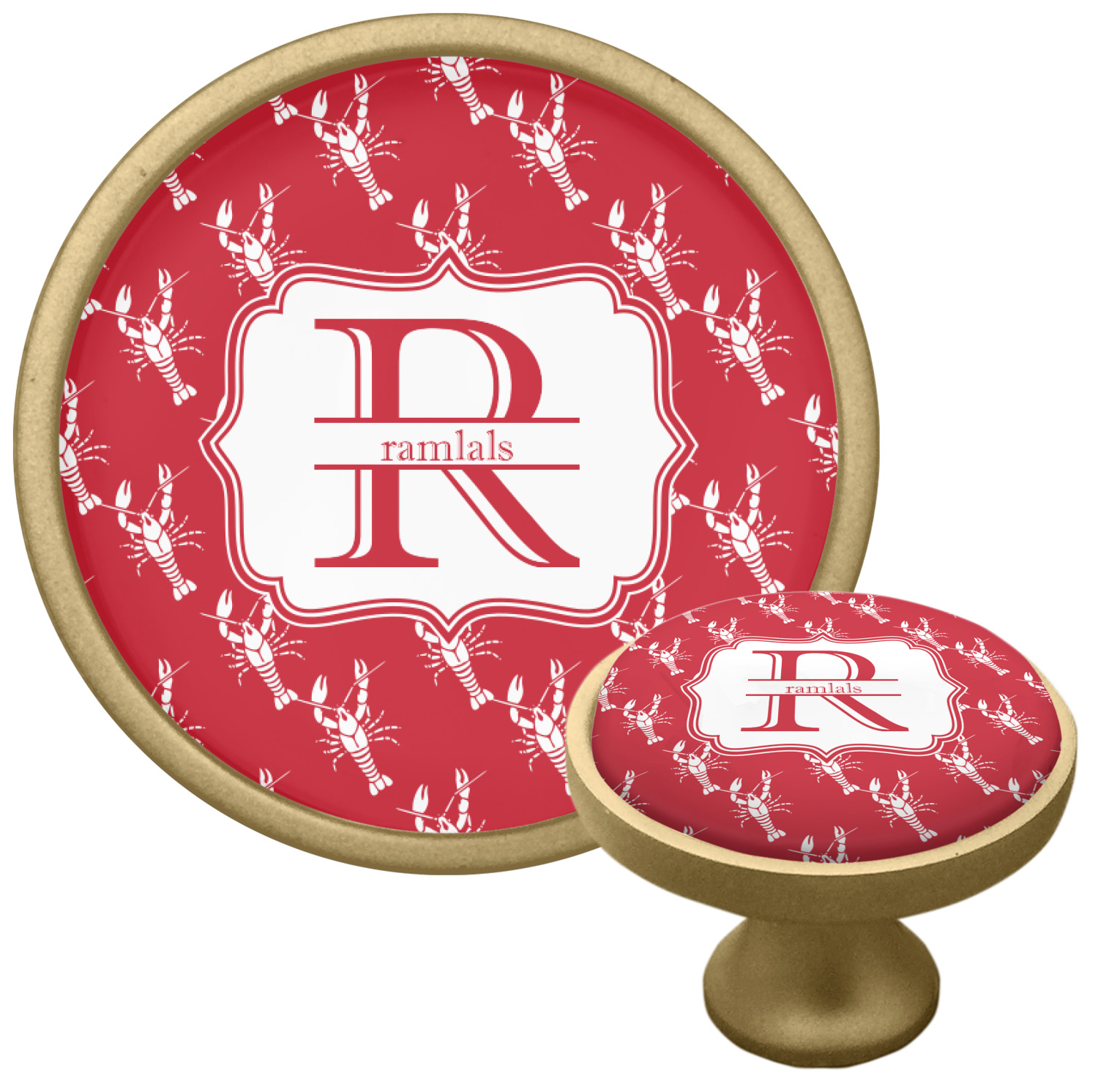 The design is done is a red background with white crawfish, while the personalization is inside a beautiful decorative rectangular frame. The personalization style is an initial along with the name.