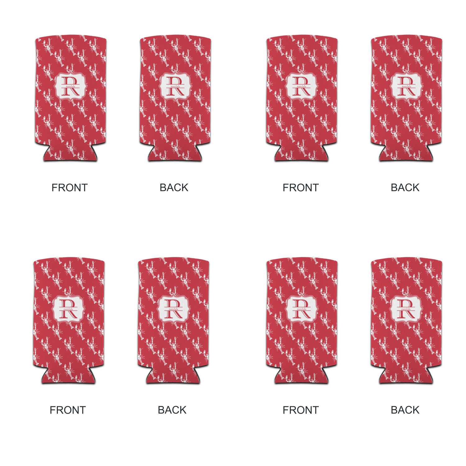 The design is done is a red background with white crawfish, while the personalization is inside a beautiful decorative rectangular frame. The personalization style is an initial along with the name.