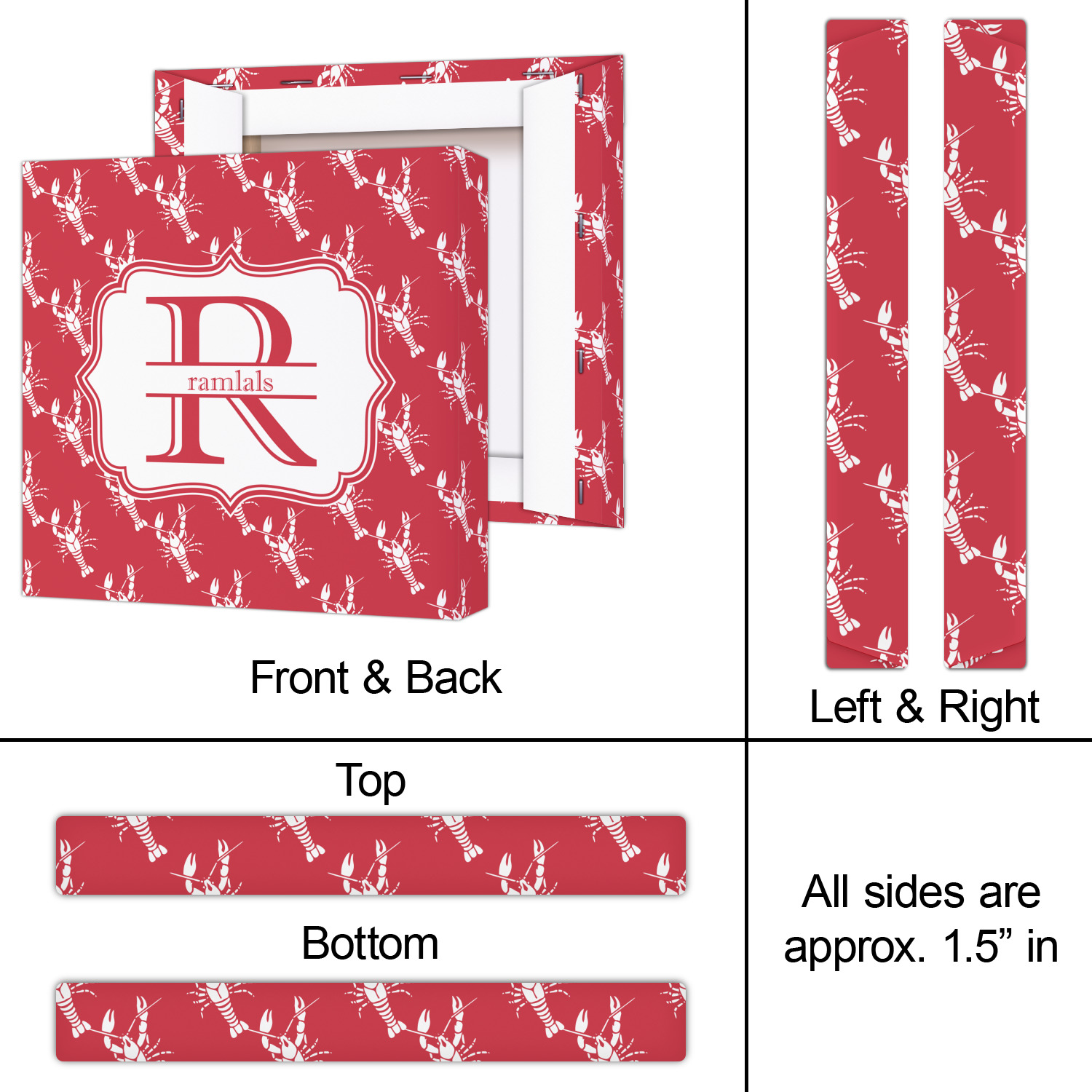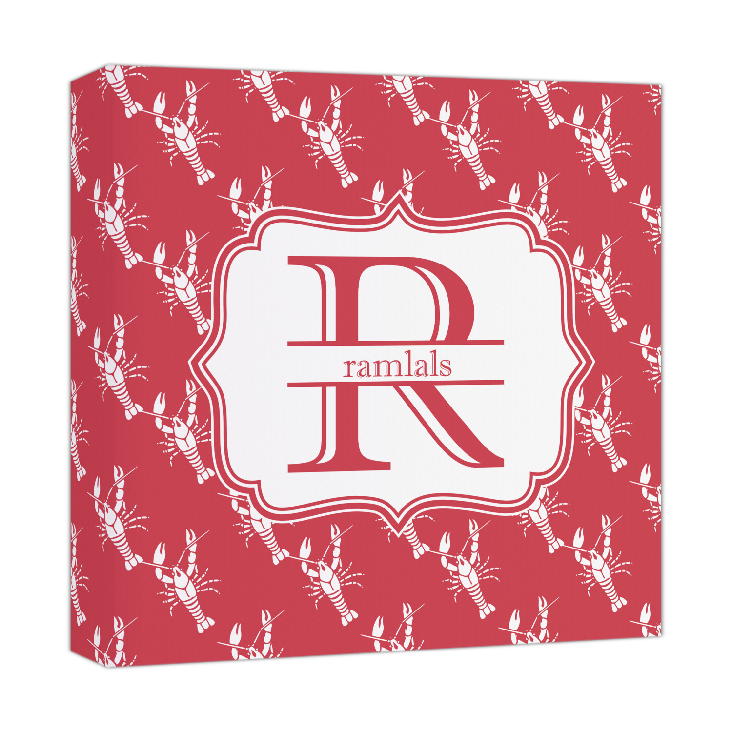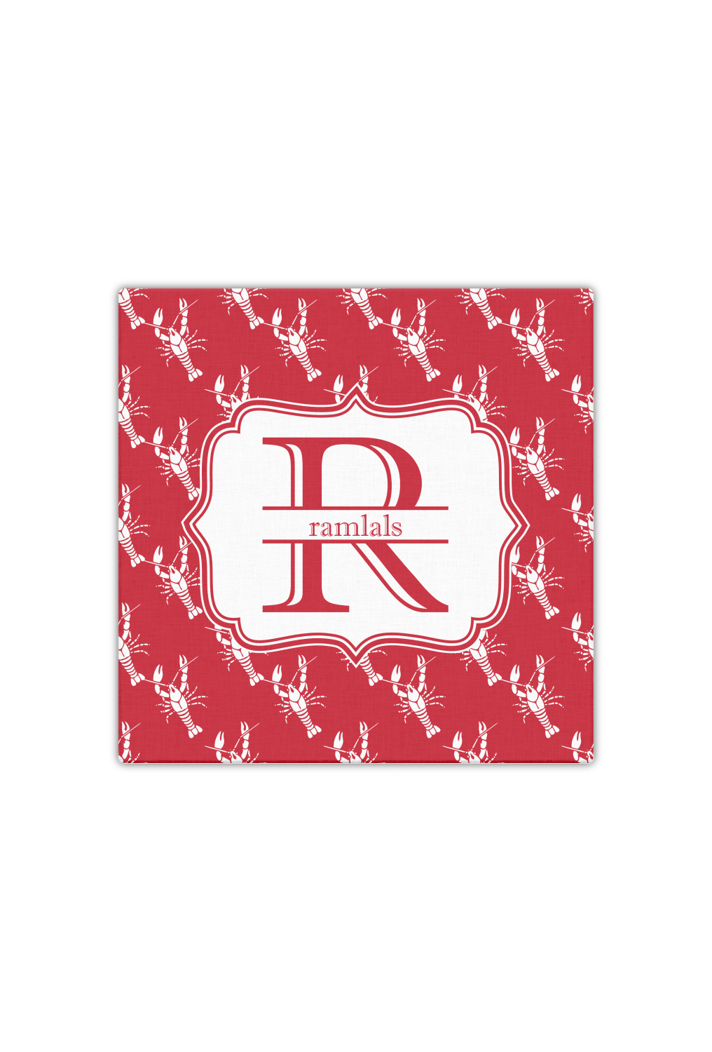 The design is done is a red background with white crawfish, while the personalization is inside a beautiful decorative rectangular frame. The personalization style is an initial along with the name.