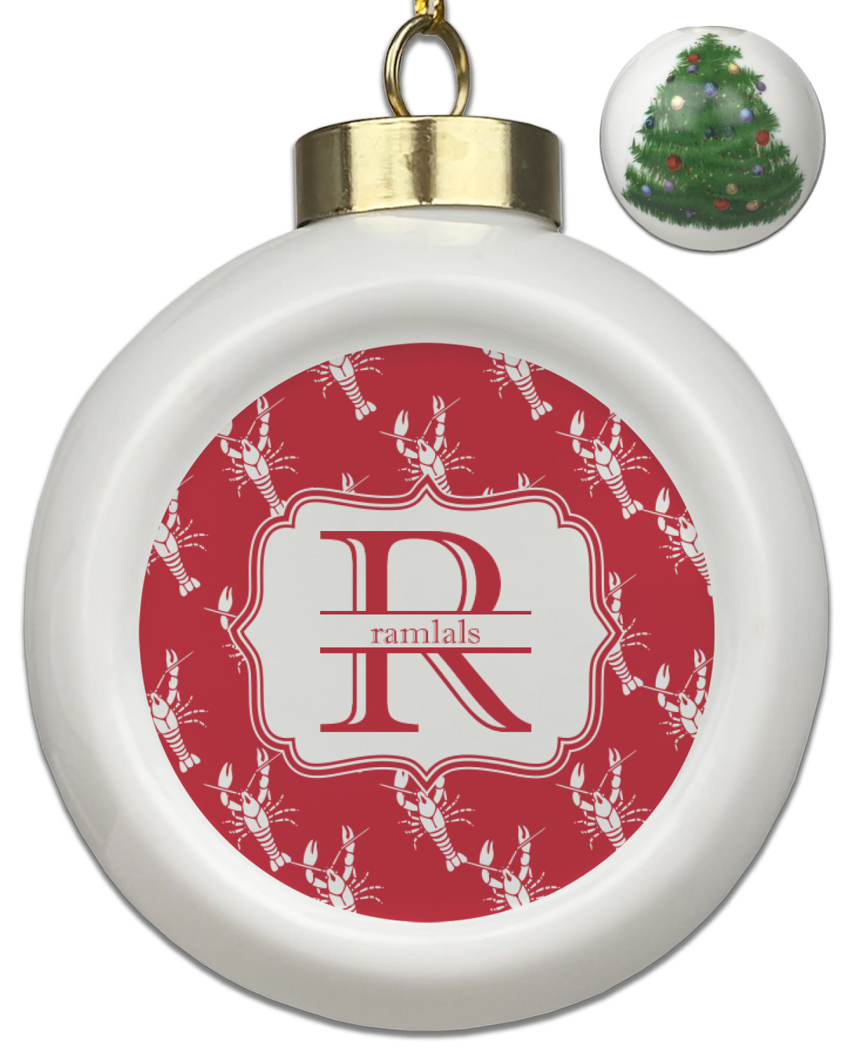 The design is done is a red background with white crawfish, while the personalization is inside a beautiful decorative rectangular frame. The personalization style is an initial along with the name.