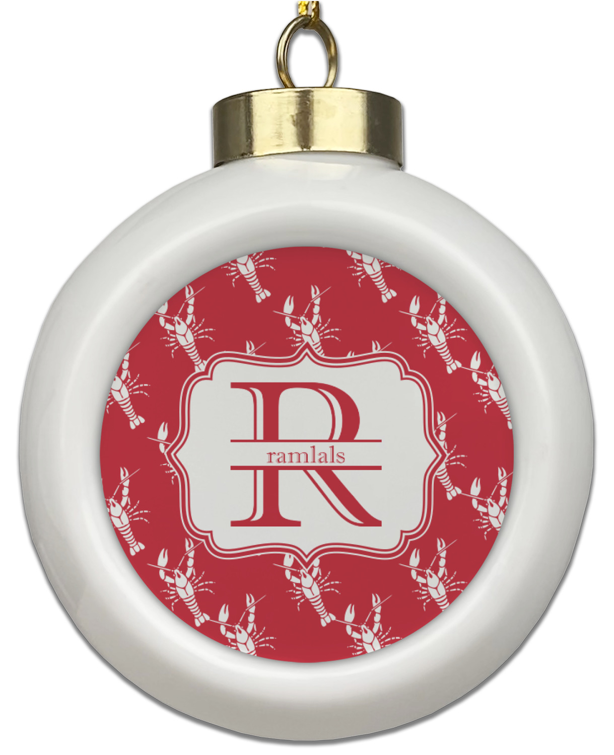 The design is done is a red background with white crawfish, while the personalization is inside a beautiful decorative rectangular frame. The personalization style is an initial along with the name.