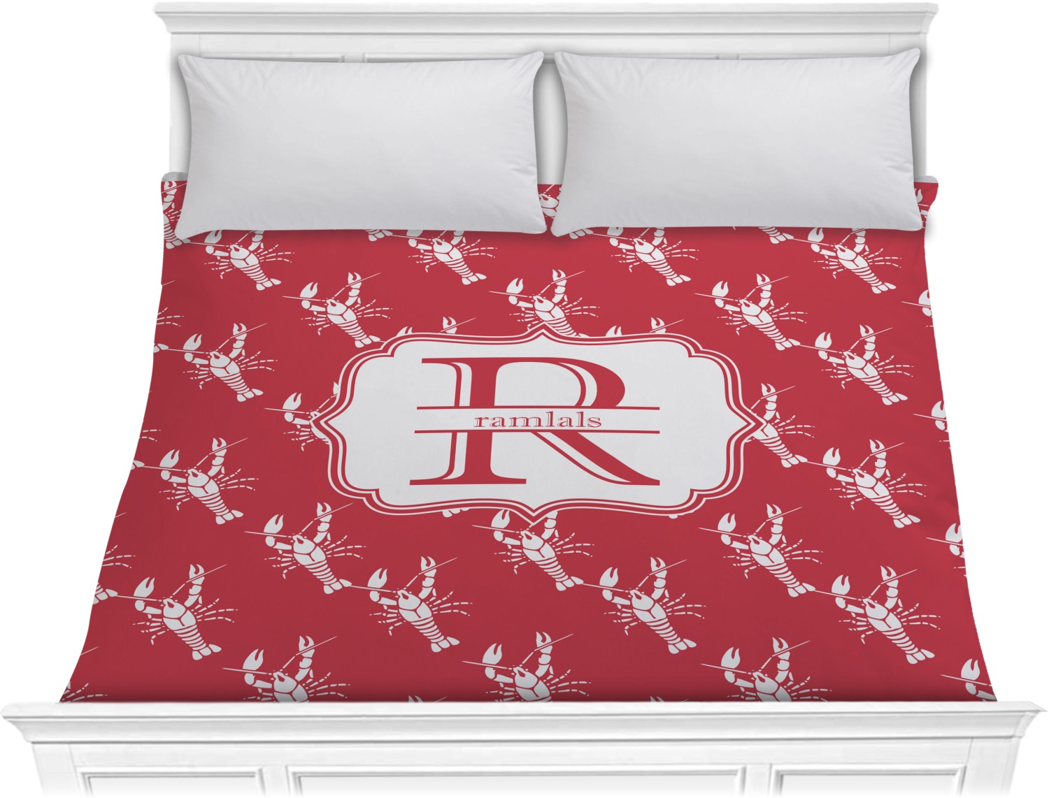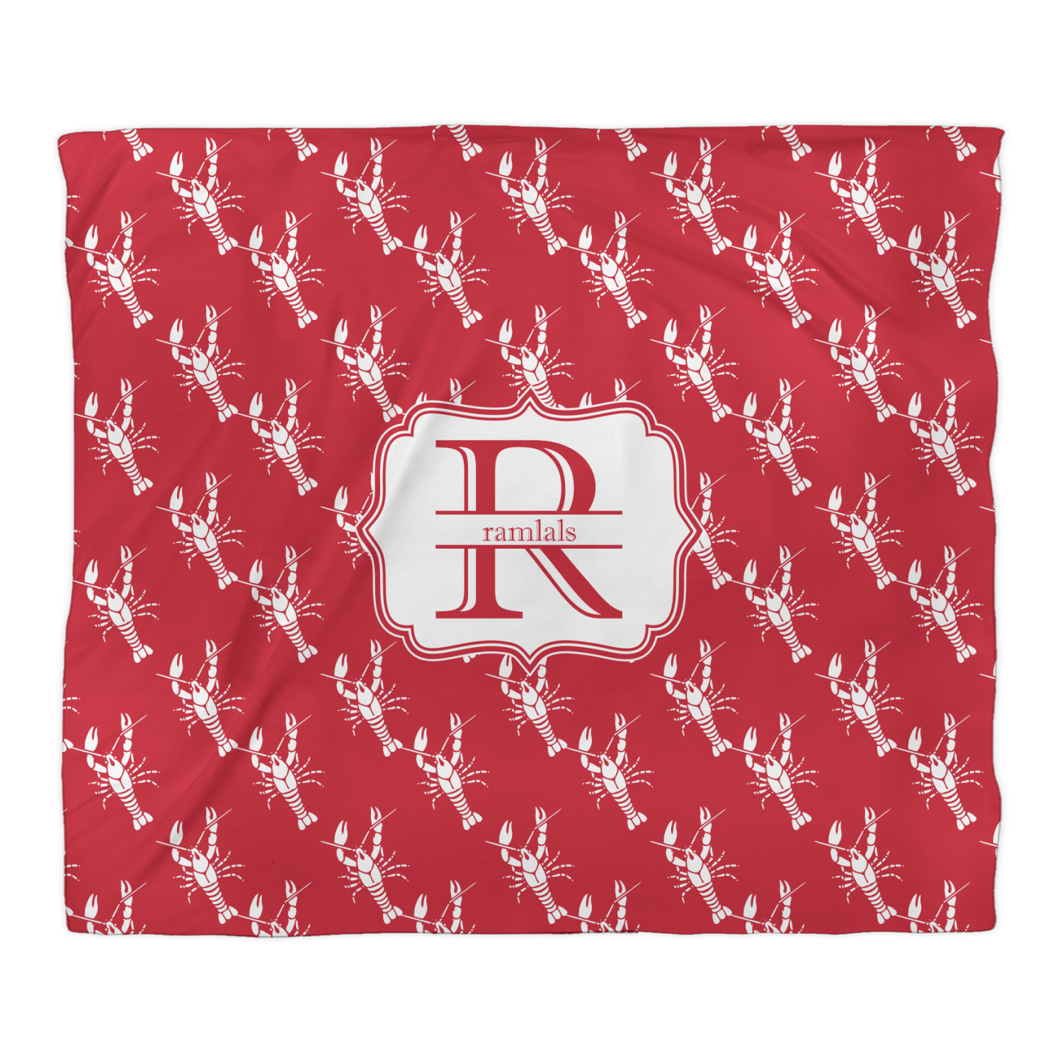 The design is done is a red background with white crawfish, while the personalization is inside a beautiful decorative rectangular frame. The personalization style is an initial along with the name.