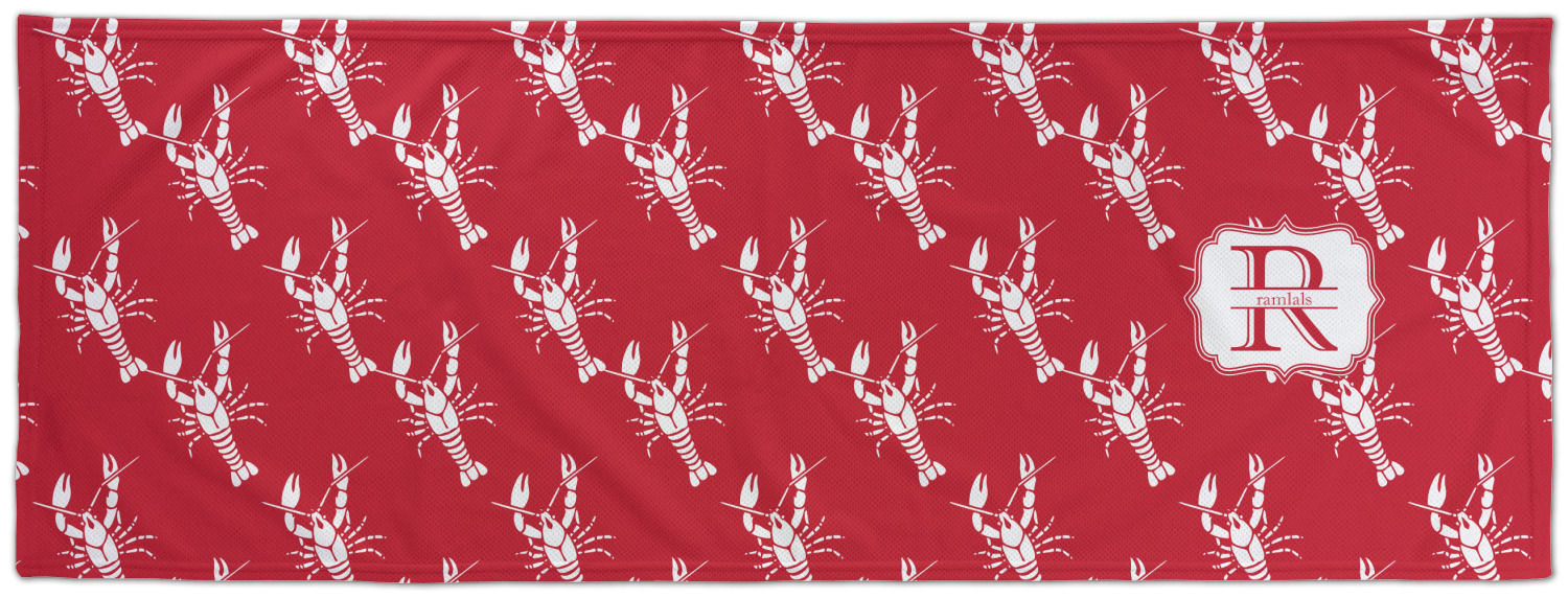 The design is done is a red background with white crawfish, while the personalization is inside a beautiful decorative rectangular frame. The personalization style is an initial along with the name.