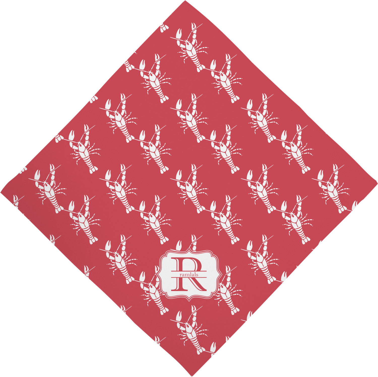 The design is done is a red background with white crawfish, while the personalization is inside a beautiful decorative rectangular frame. The personalization style is an initial along with the name.