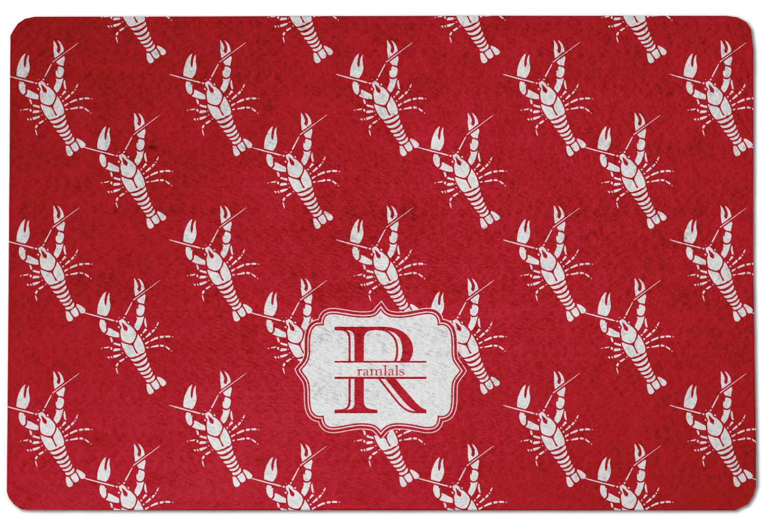 The design is done is a red background with white crawfish, while the personalization is inside a beautiful decorative rectangular frame. The personalization style is an initial along with the name.