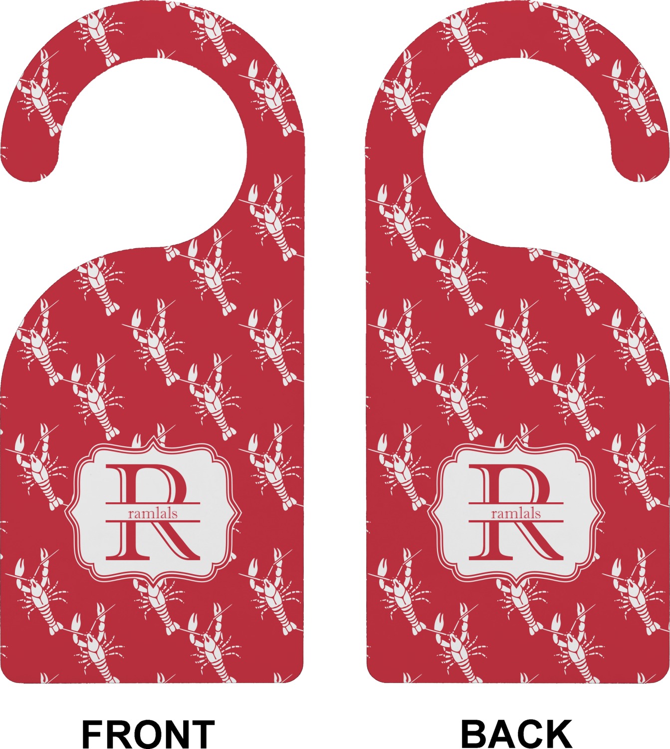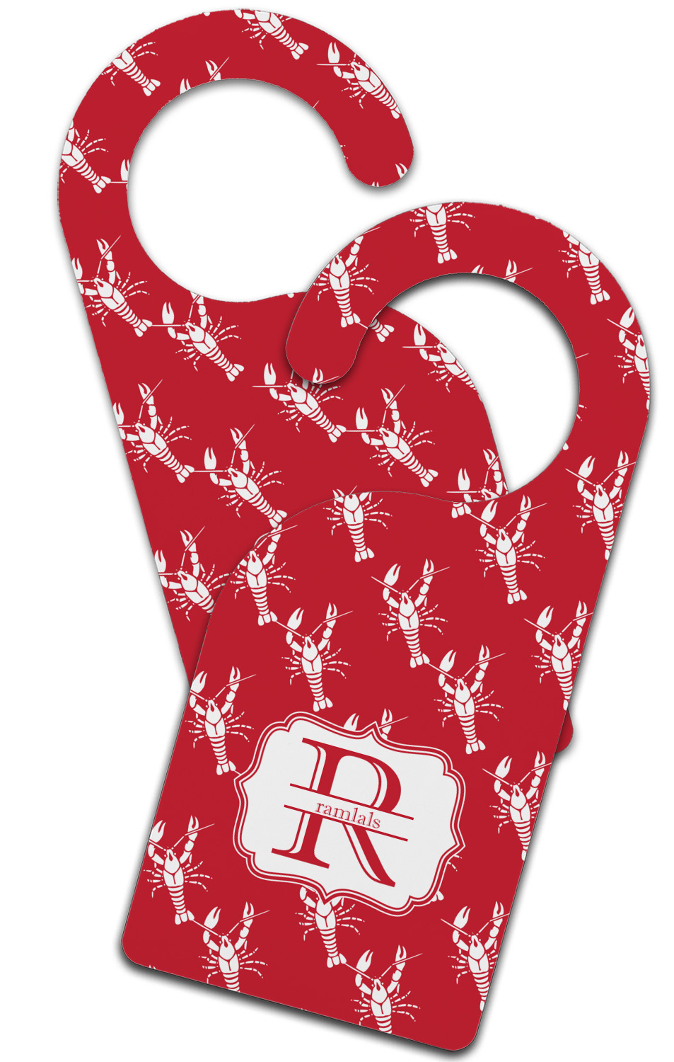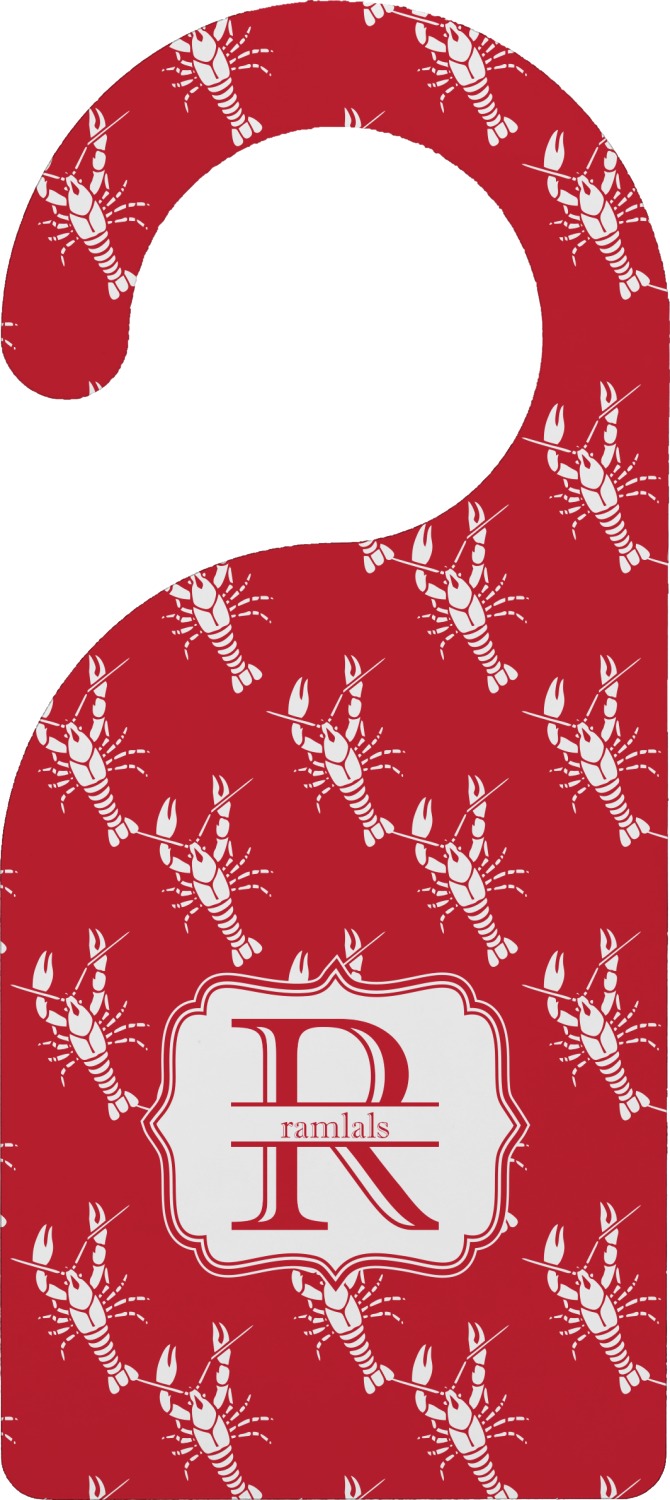 The design is done is a red background with white crawfish, while the personalization is inside a beautiful decorative rectangular frame. The personalization style is an initial along with the name.