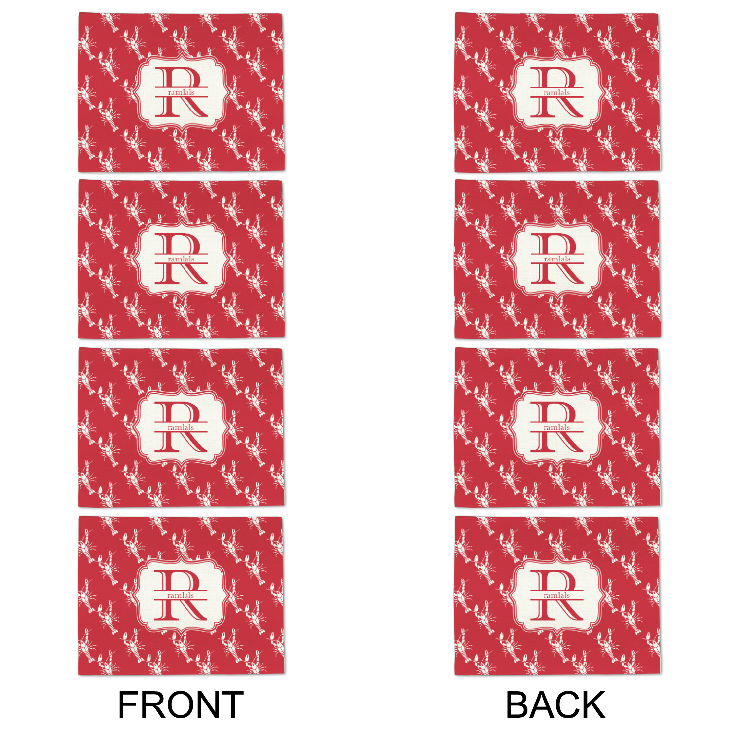 The design is done is a red background with white crawfish, while the personalization is inside a beautiful decorative rectangular frame. The personalization style is an initial along with the name.