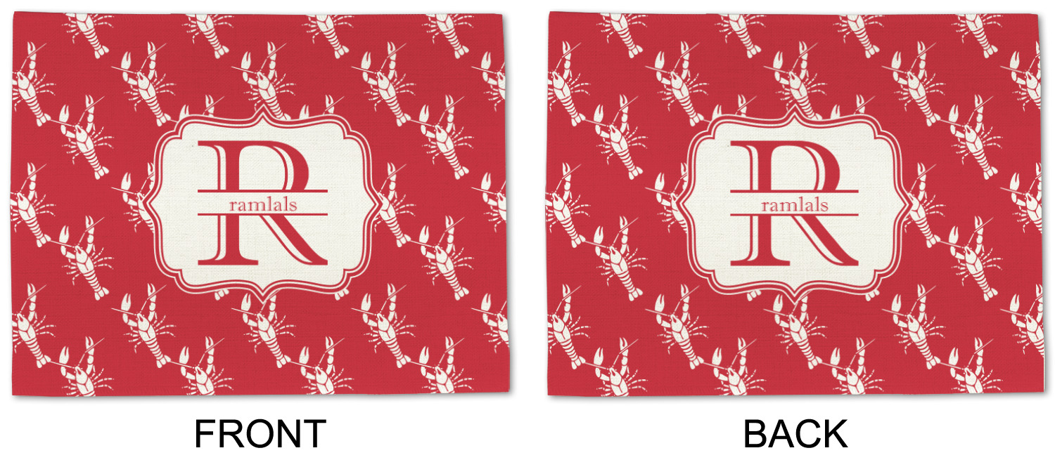 The design is done is a red background with white crawfish, while the personalization is inside a beautiful decorative rectangular frame. The personalization style is an initial along with the name.