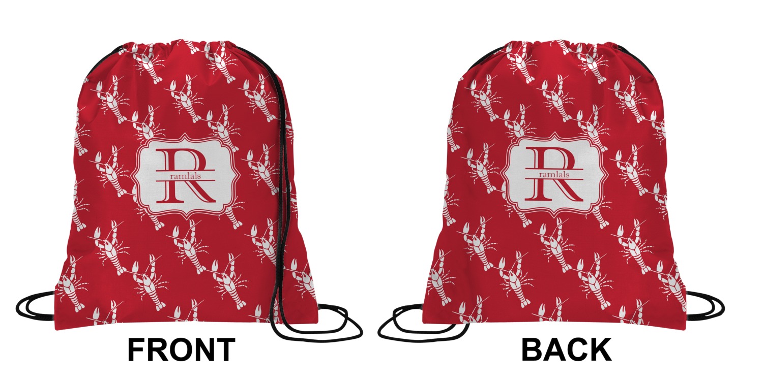 Your custom design will appear on the front and the back of the backpack. You can customize each side individually. The inside of the backpack is white and the drawstrings are black. The back pack is made of 100% polyester fabric.