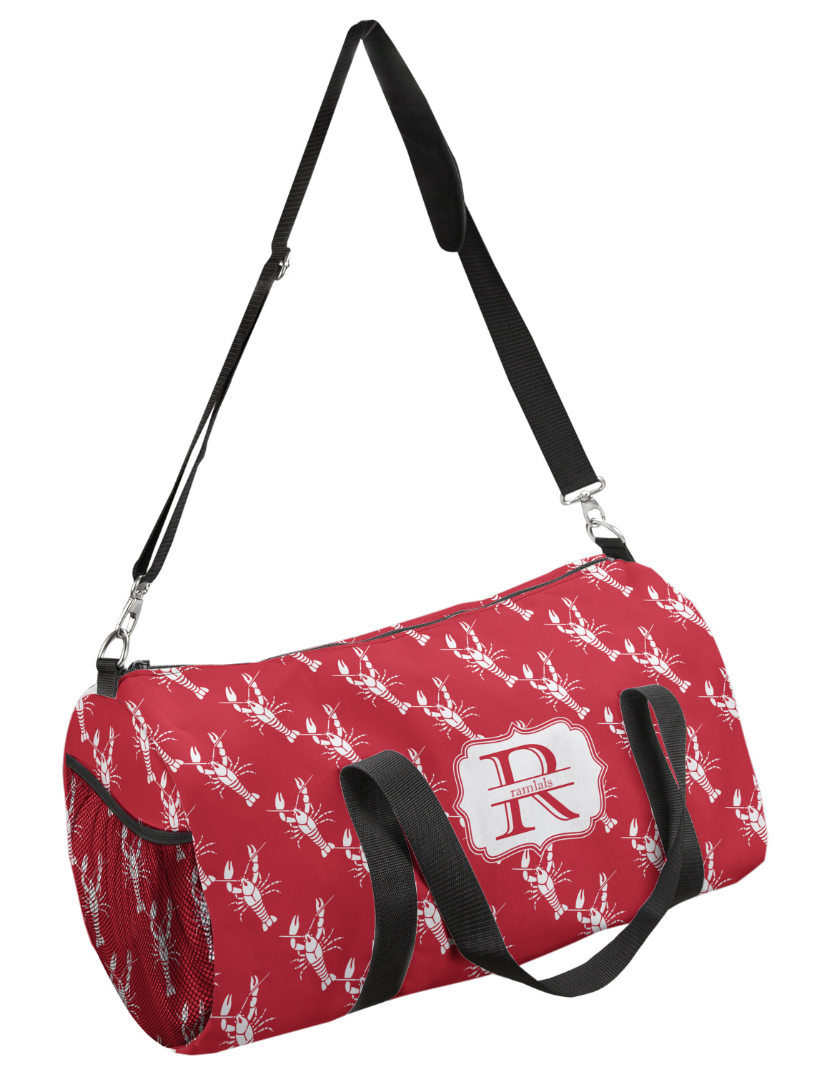 This duffle is a sturdy bag made of a canvas material. It comes in two sizes: Small (19"W x 9.5"H x 9.5"D) and Large (23"W x 12"H x 12"D). The bag is a cylindrical shape with a black adjustable strap and two handles. On one side is an elastic pouch to put a waterbottle or other small item. Your product will be sublimated with your design and is able to be designed on the front, back, and sides. Be sure to remember that the straps may cut into parts of your design if you upload your own artwork.