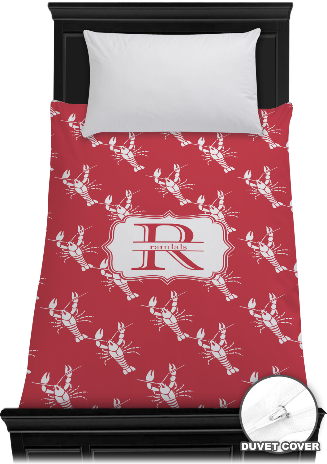 The design is done is a red background with white crawfish, while the personalization is inside a beautiful decorative rectangular frame. The personalization style is an initial along with the name.