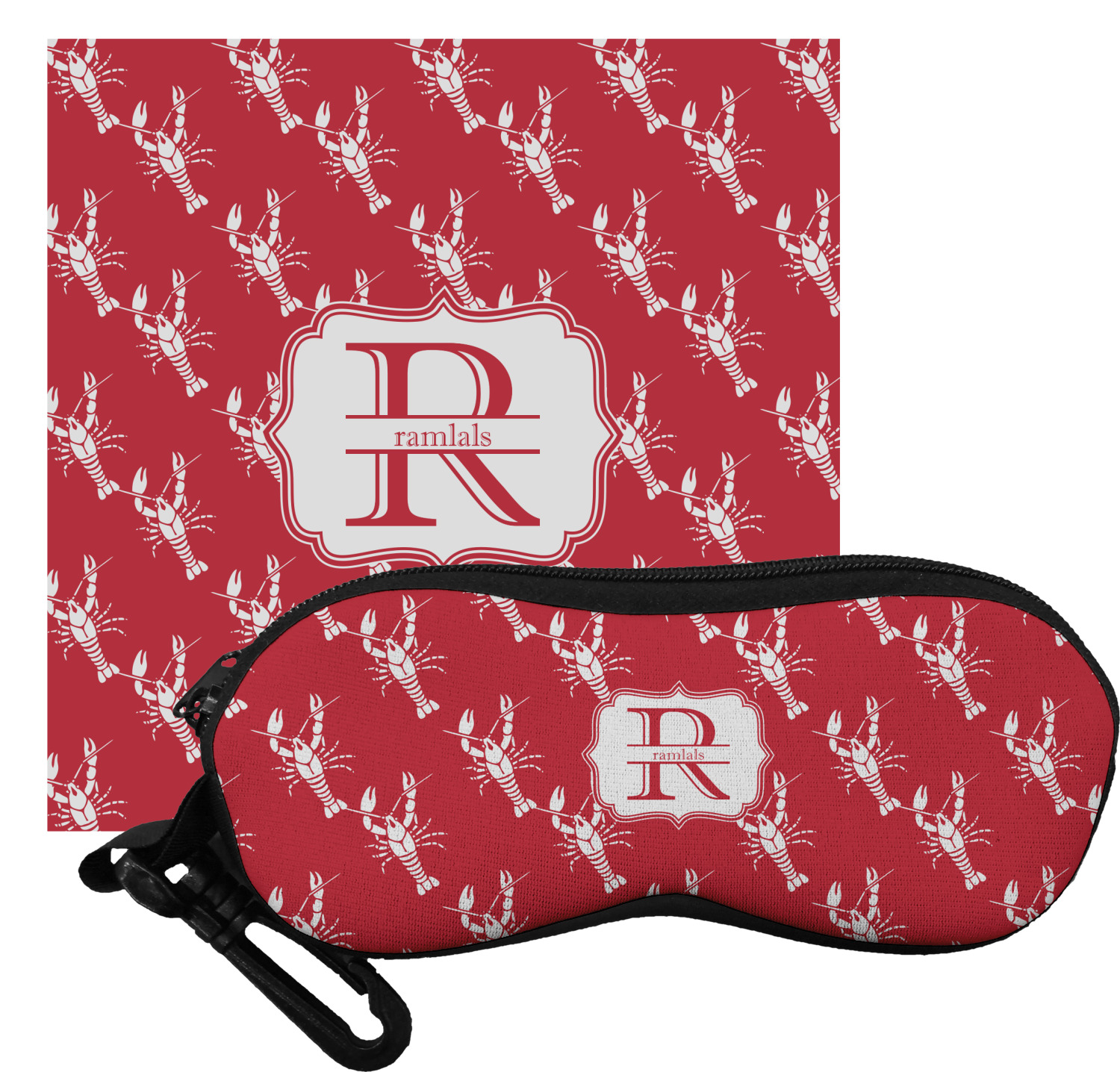 The design is done is a red background with white crawfish, while the personalization is inside a beautiful decorative rectangular frame. The personalization style is an initial along with the name.