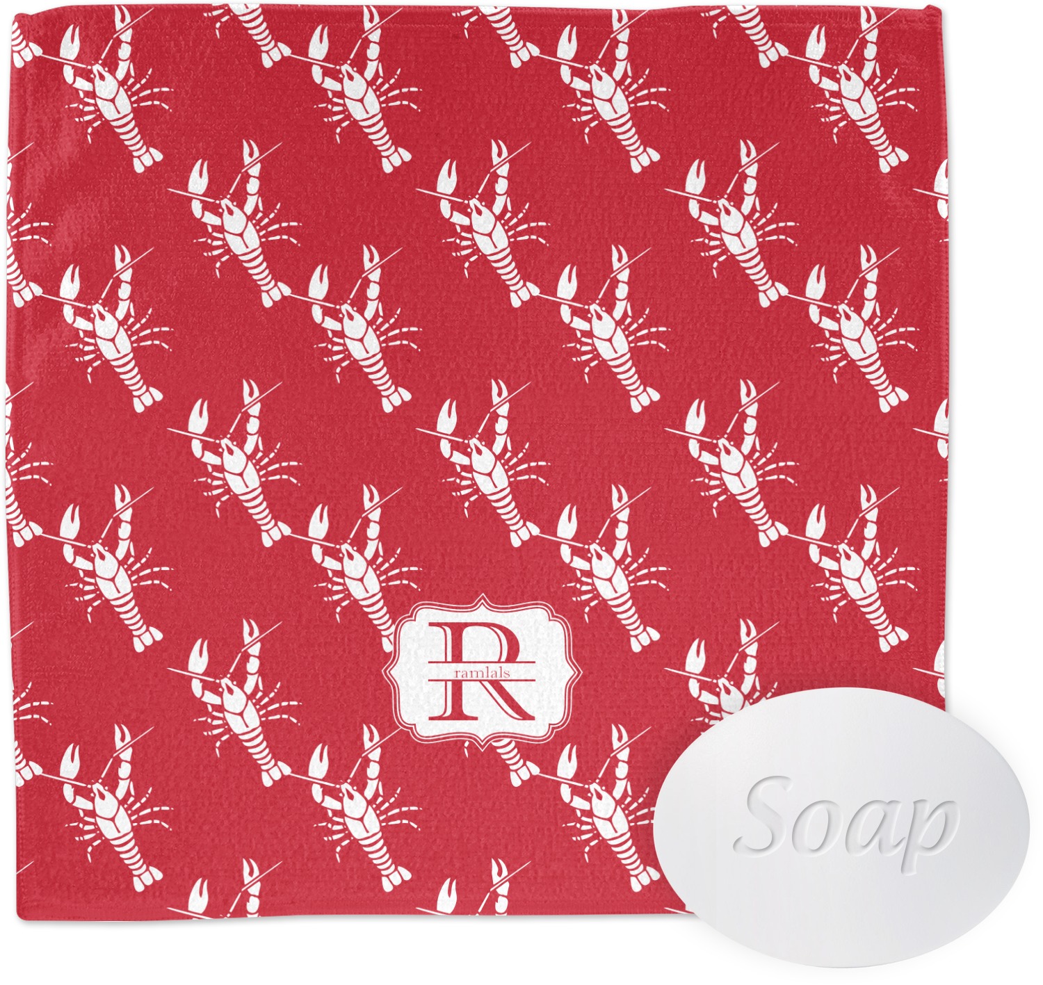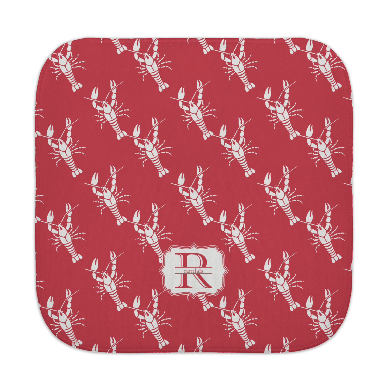 The design is done is a red background with white crawfish, while the personalization is inside a beautiful decorative rectangular frame. The personalization style is an initial along with the name.