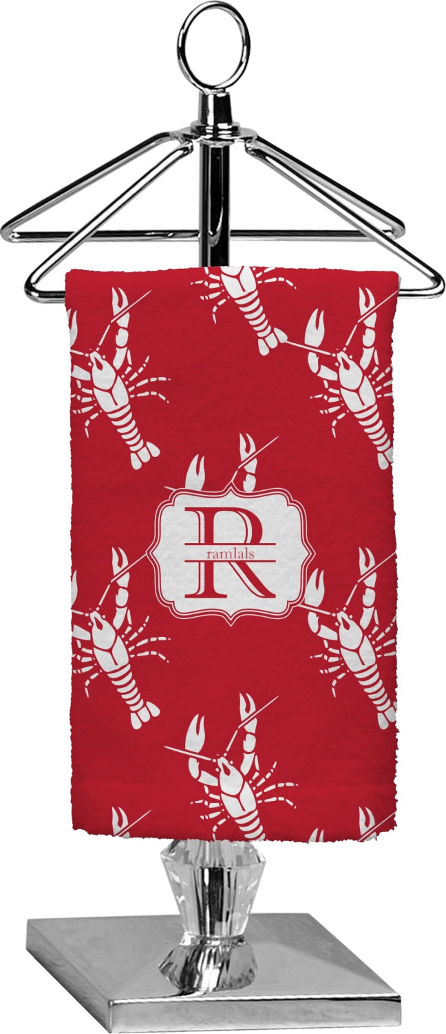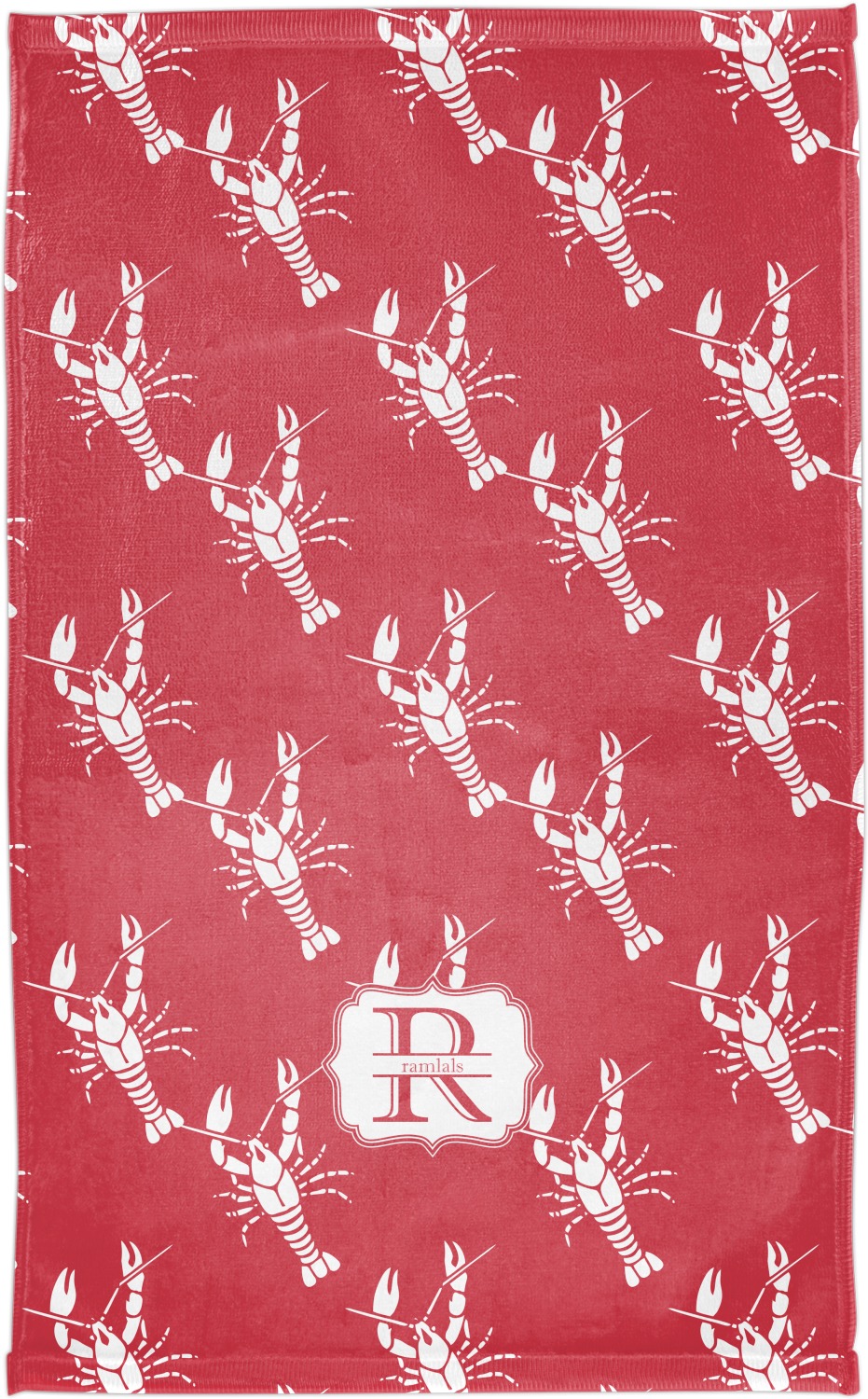 The design is done is a red background with white crawfish, while the personalization is inside a beautiful decorative rectangular frame. The personalization style is an initial along with the name.