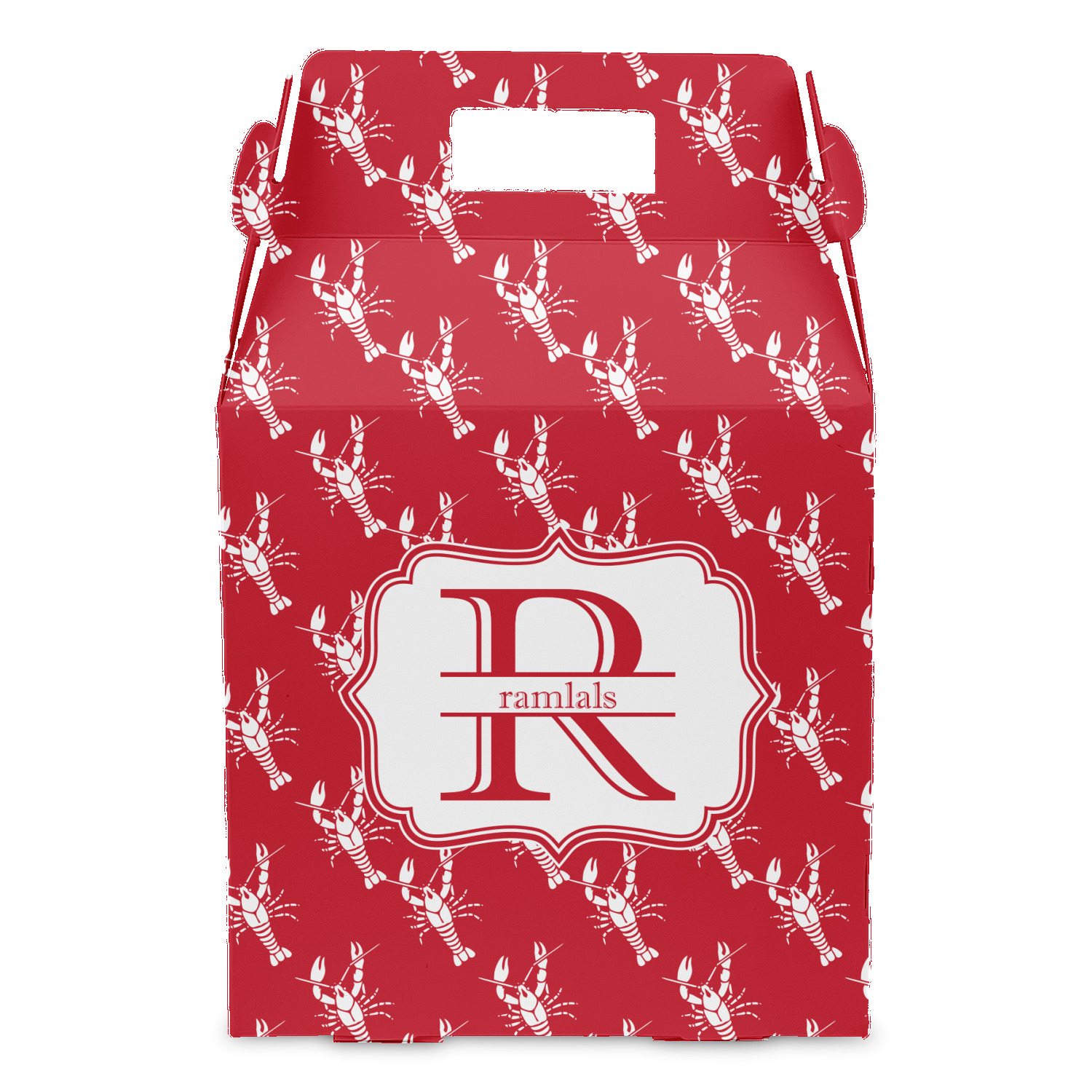 The design is done is a red background with white crawfish, while the personalization is inside a beautiful decorative rectangular frame. The personalization style is an initial along with the name.