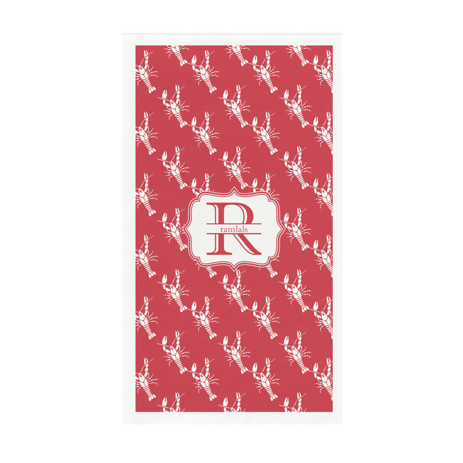 The design is done is a red background with white crawfish, while the personalization is inside a beautiful decorative rectangular frame. The personalization style is an initial along with the name.