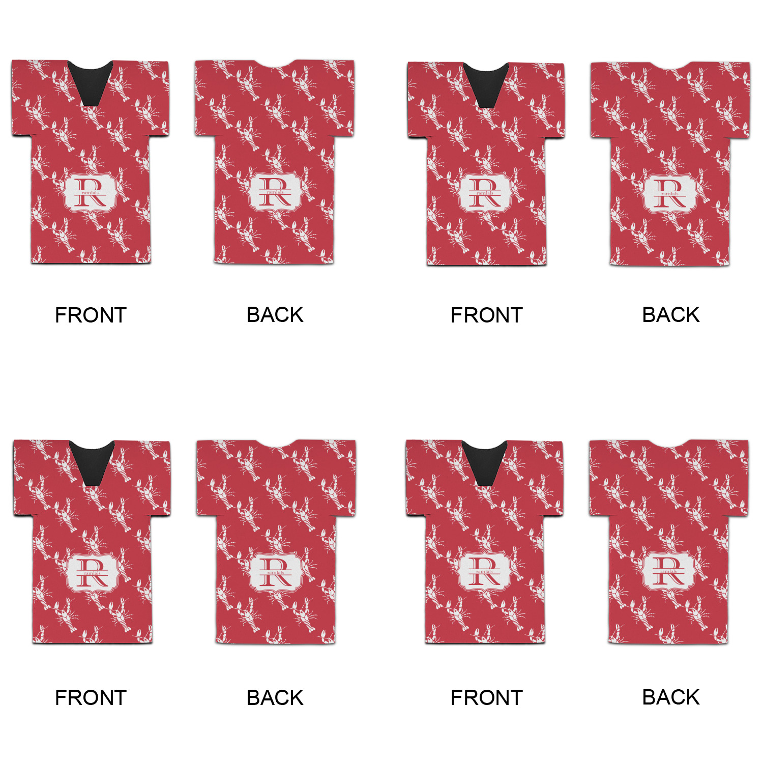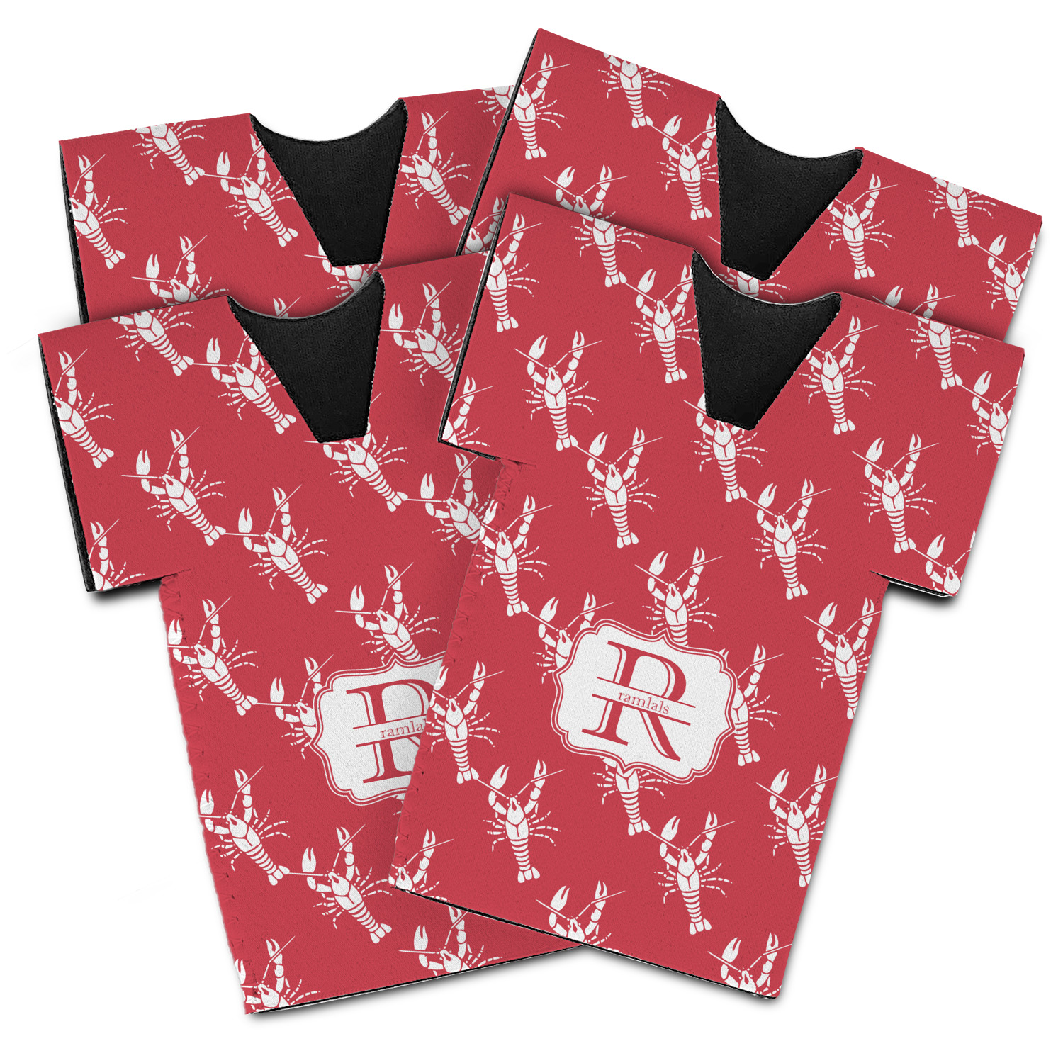 The design is done is a red background with white crawfish, while the personalization is inside a beautiful decorative rectangular frame. The personalization style is an initial along with the name.