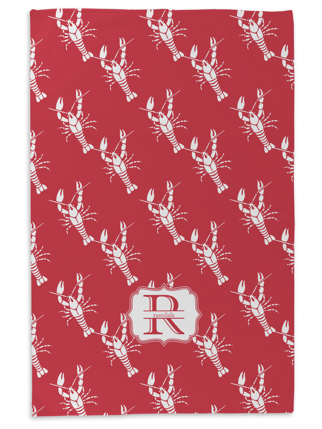 The design is done is a red background with white crawfish, while the personalization is inside a beautiful decorative rectangular frame. The personalization style is an initial along with the name.