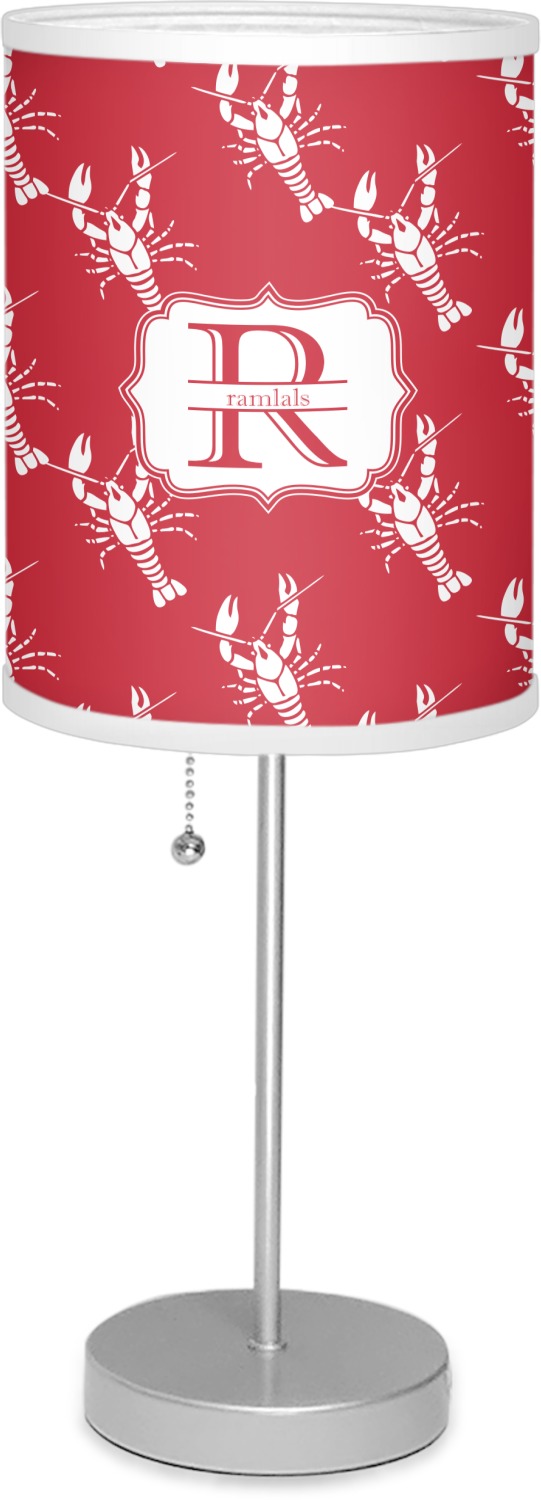 The design is done is a red background with white crawfish, while the personalization is inside a beautiful decorative rectangular frame. The personalization style is an initial along with the name.