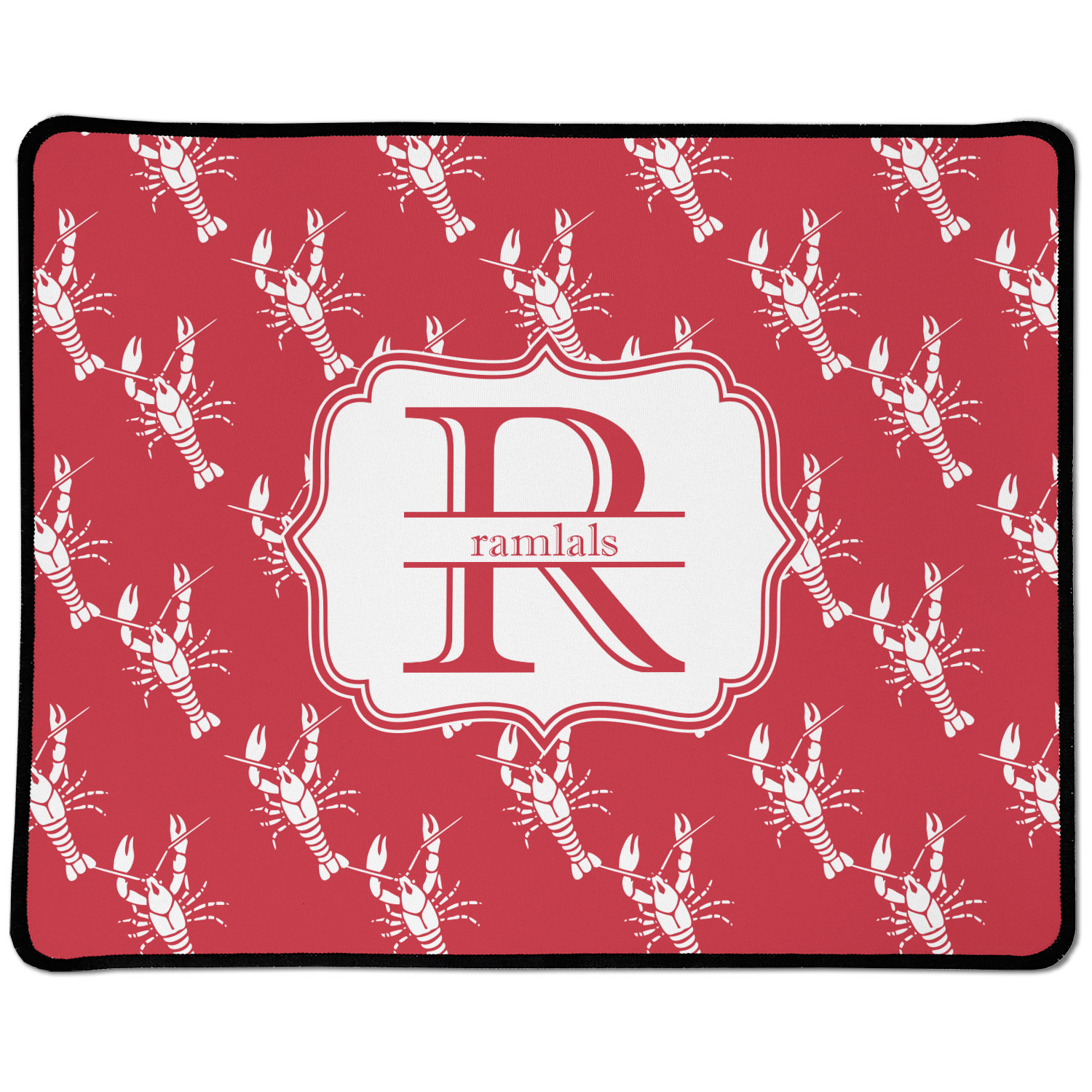 The design is done is a red background with white crawfish, while the personalization is inside a beautiful decorative rectangular frame. The personalization style is an initial along with the name.