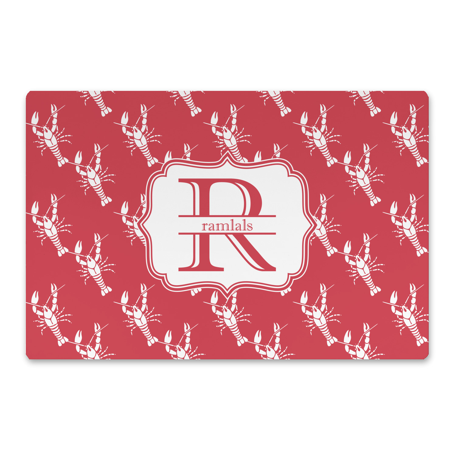 The design is done is a red background with white crawfish, while the personalization is inside a beautiful decorative rectangular frame. The personalization style is an initial along with the name.