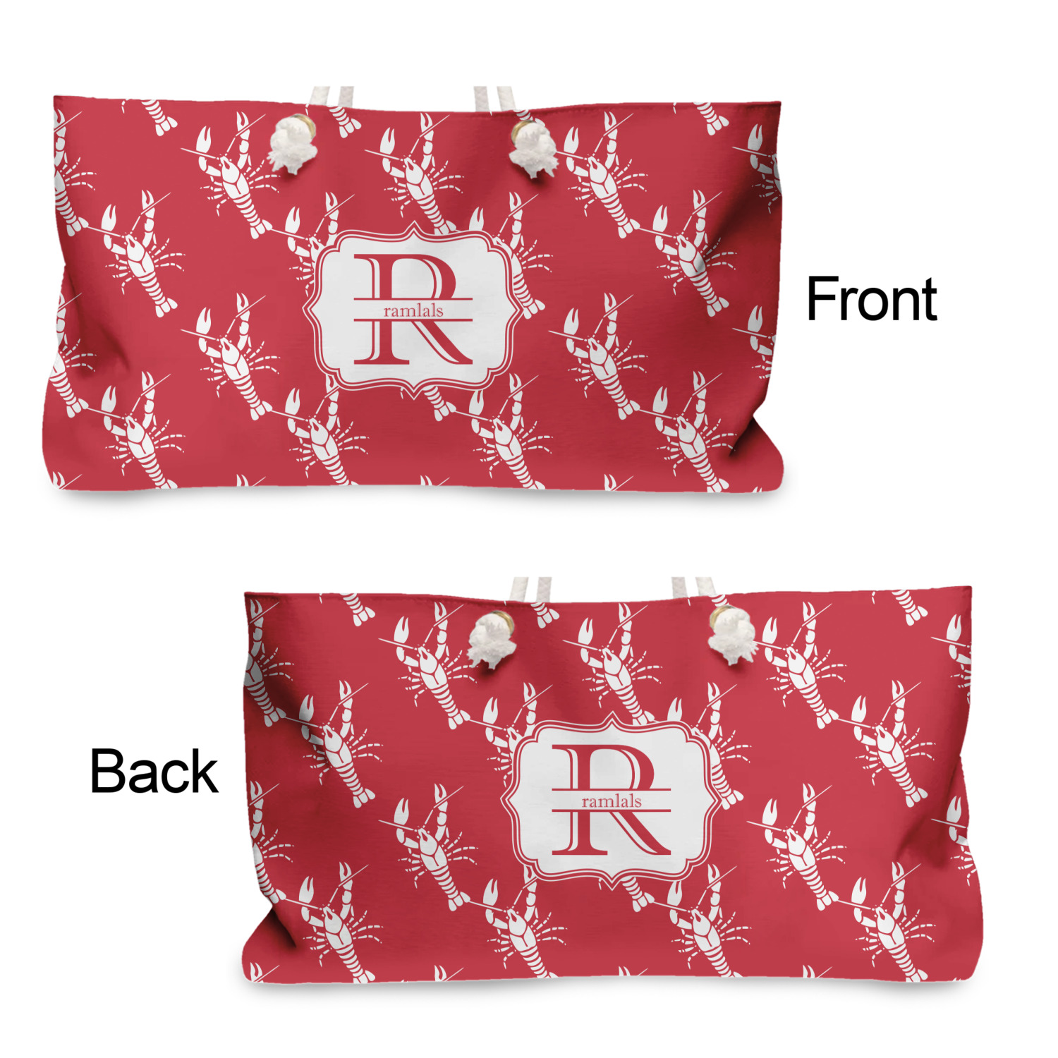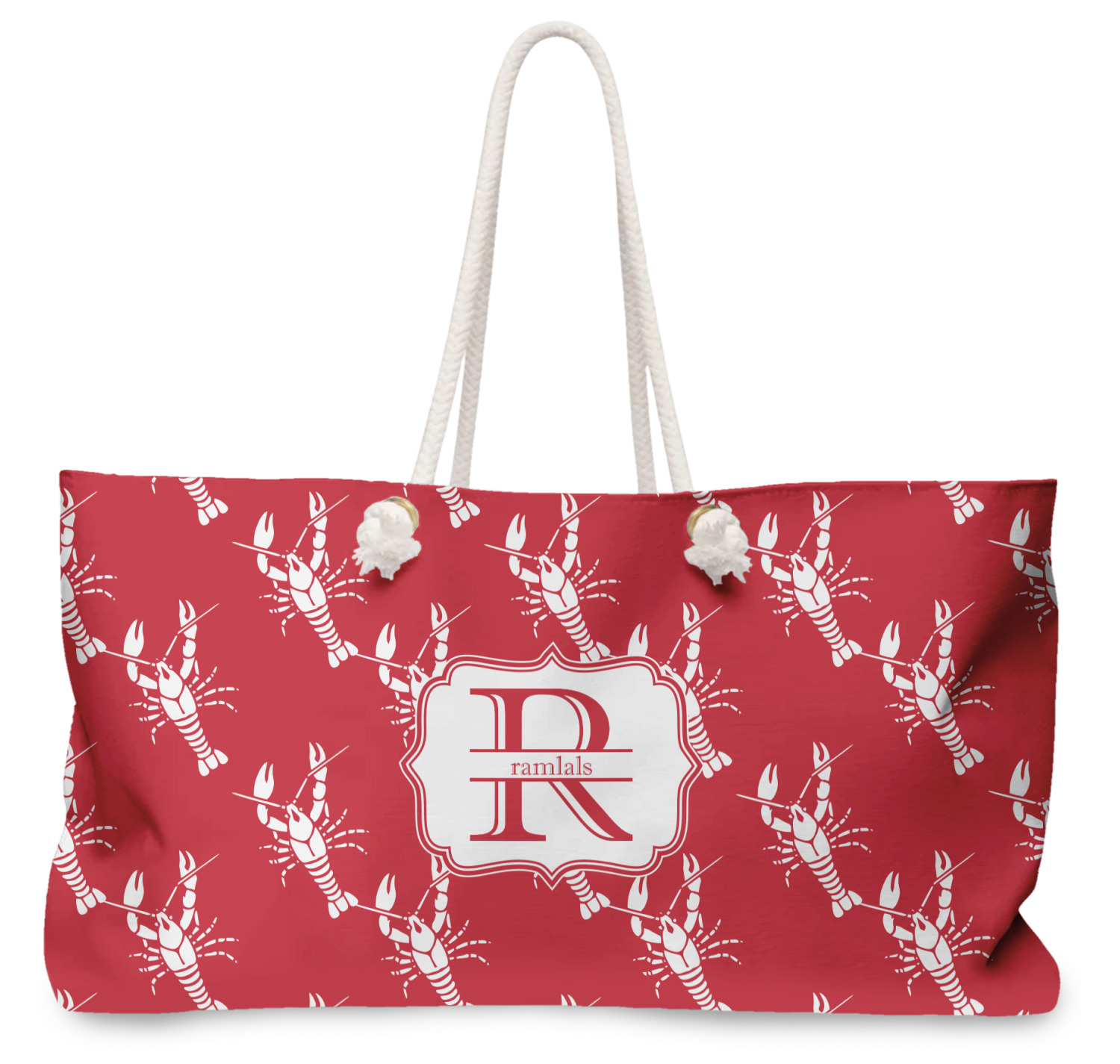 The design is done is a red background with white crawfish, while the personalization is inside a beautiful decorative rectangular frame. The personalization style is an initial along with the name.
