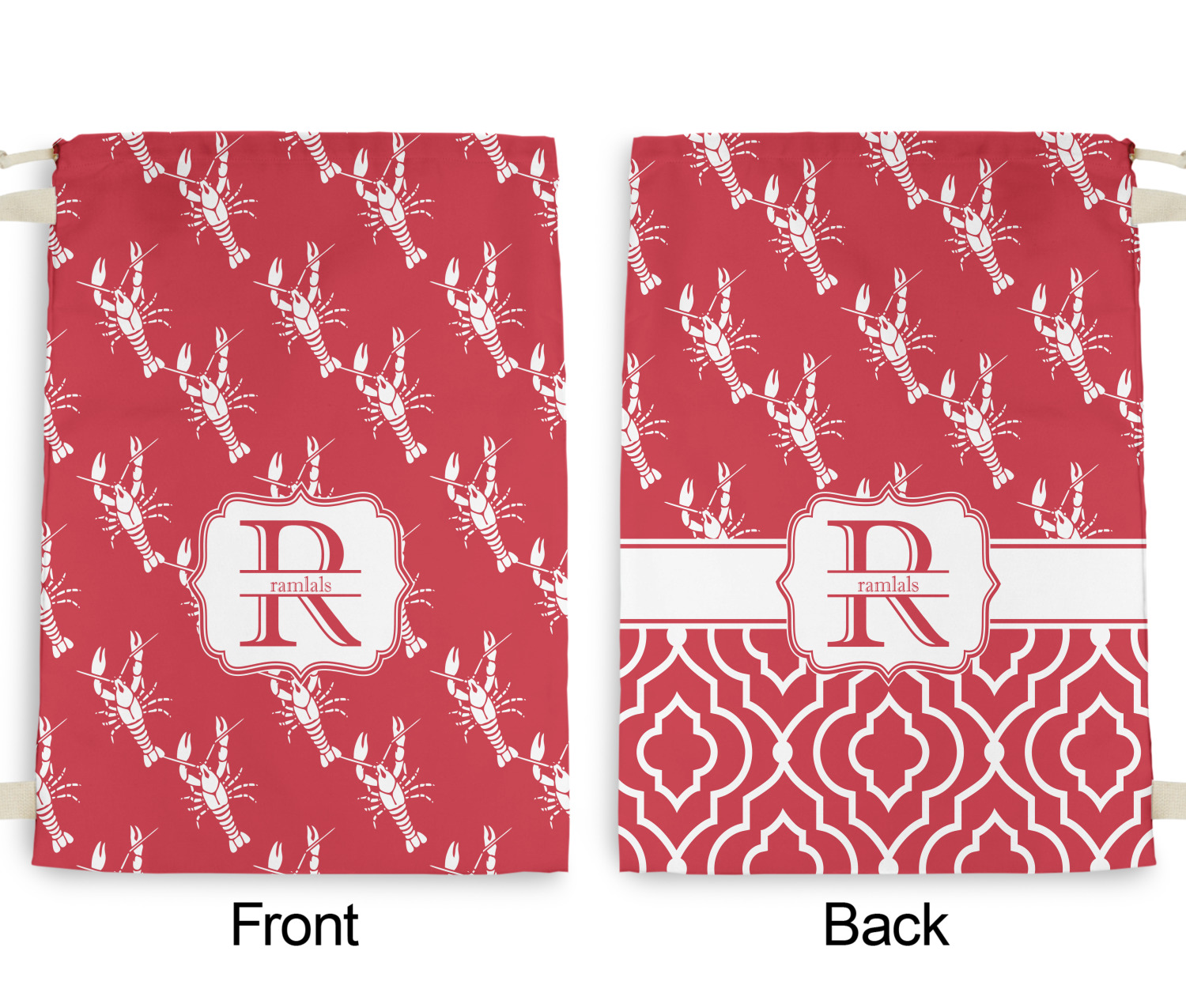 The design is done is a red background with white crawfish, while the personalization is inside a beautiful decorative rectangular frame. The personalization style is an initial along with the name.