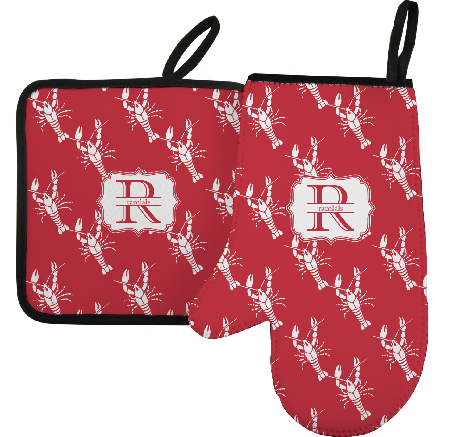 The design is done is a red background with white crawfish, while the personalization is inside a beautiful decorative rectangular frame. The personalization style is an initial along with the name.